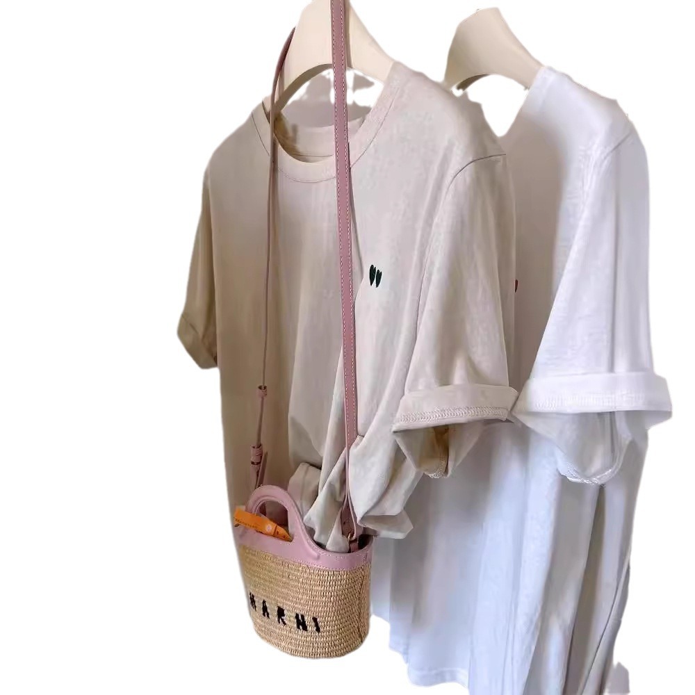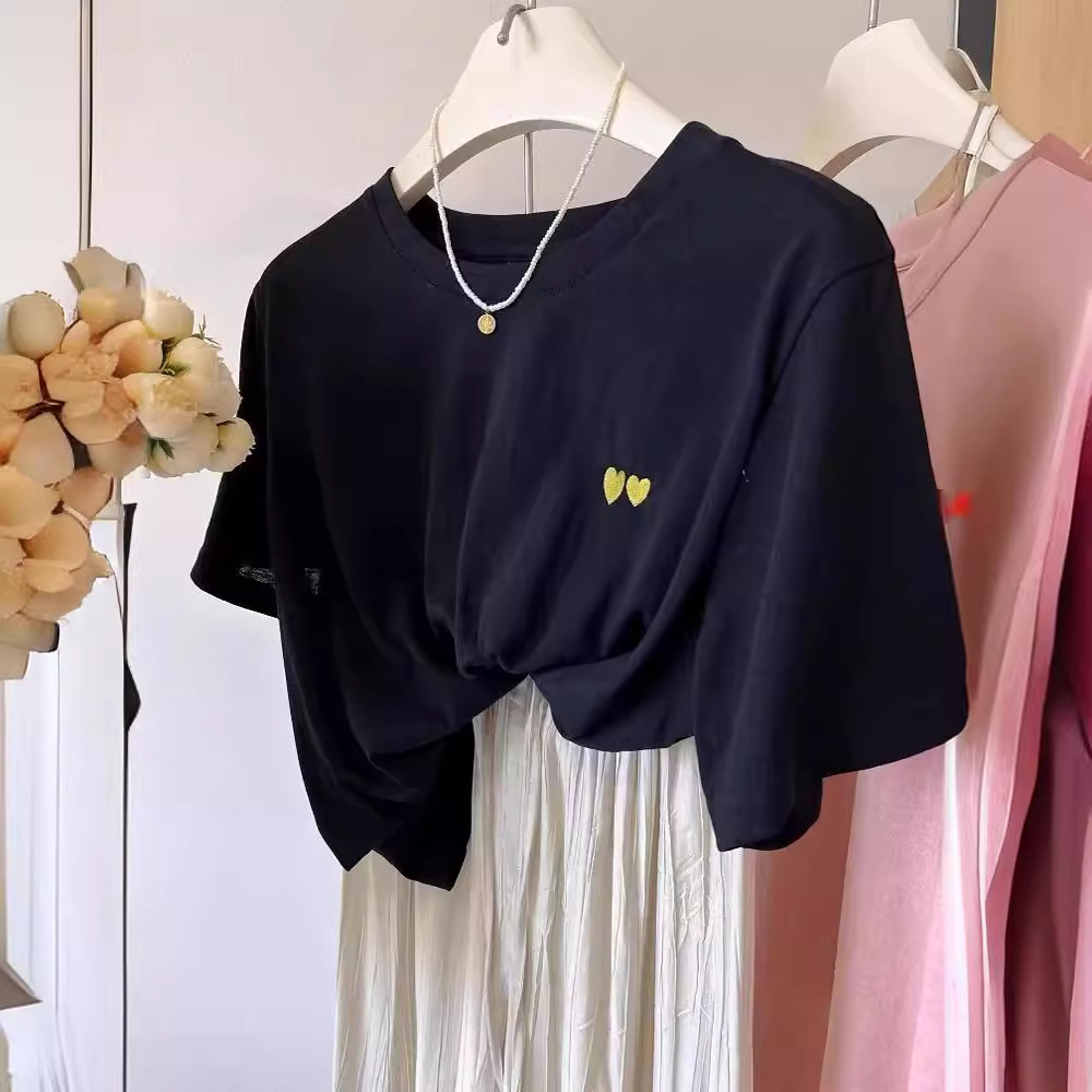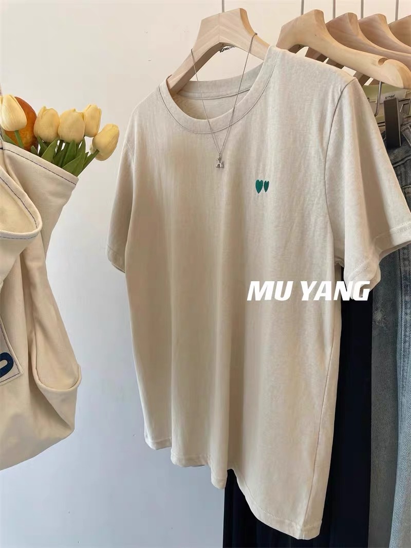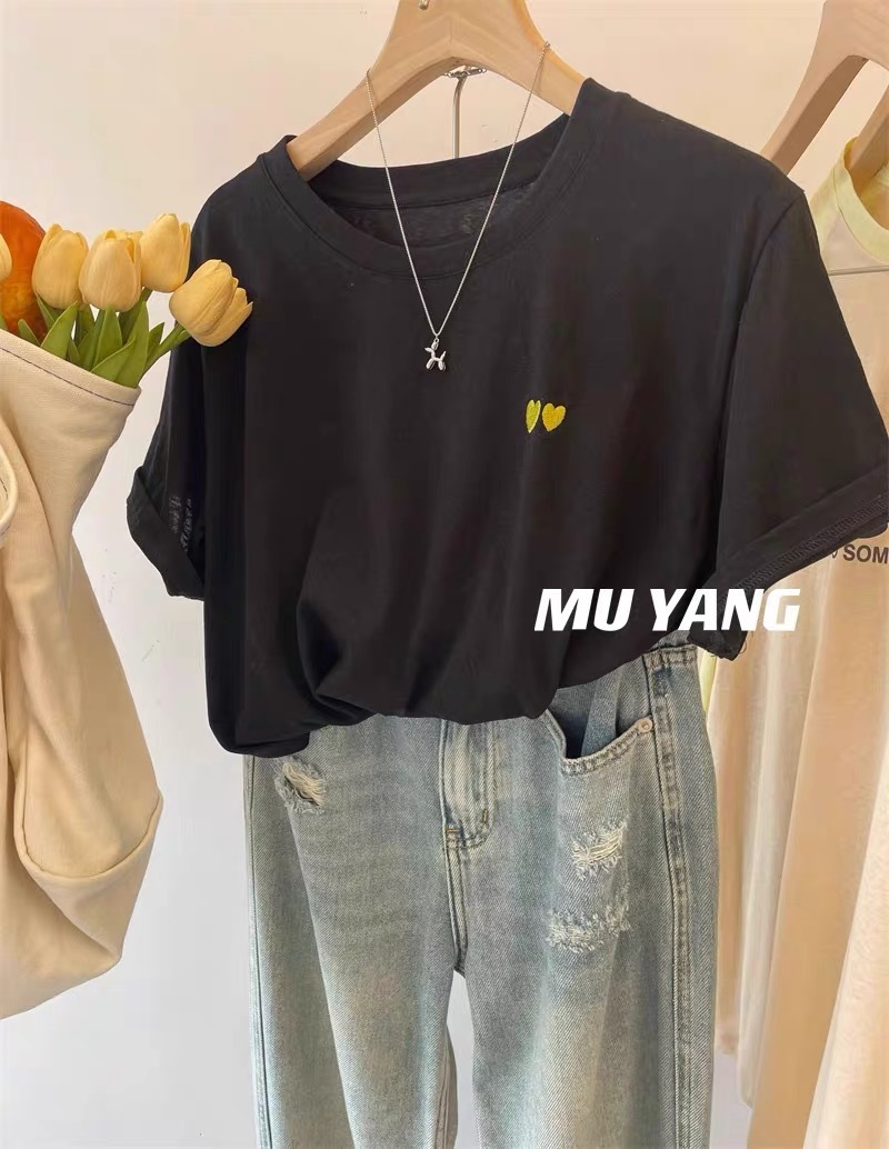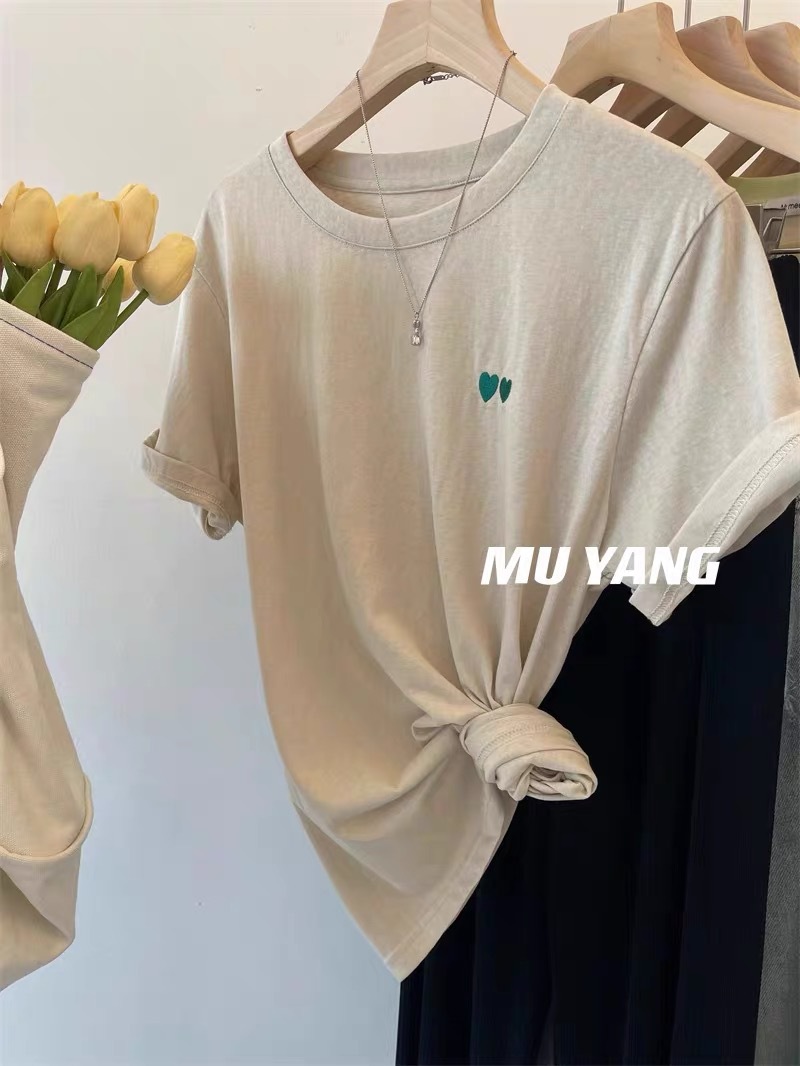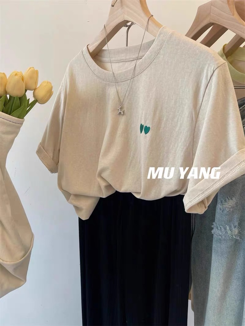 轻薄透气雪花棉爱心刺绣T恤女宽松休闲百搭圆领短袖上衣夏季新款