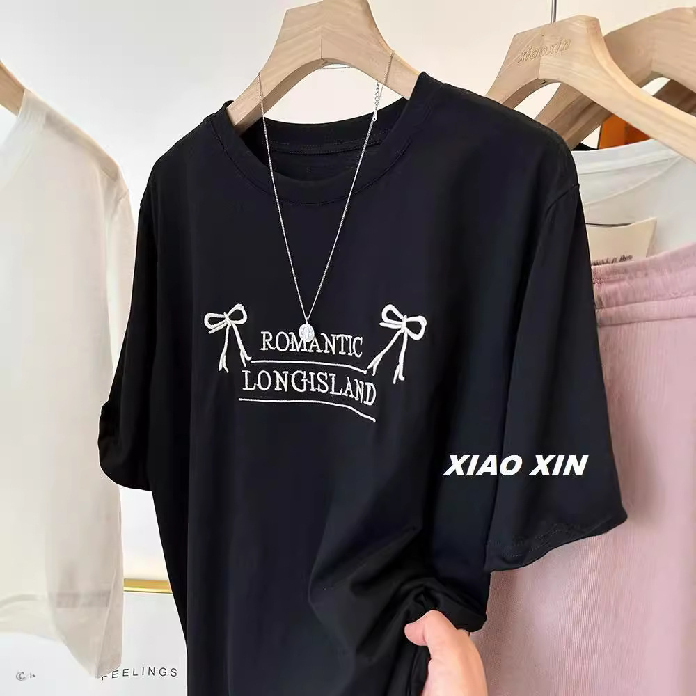 刺绣蝴蝶结夏季新款短袖t恤女韩版设计感圆领绣花百搭高档女上衣