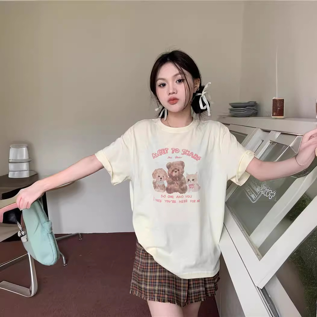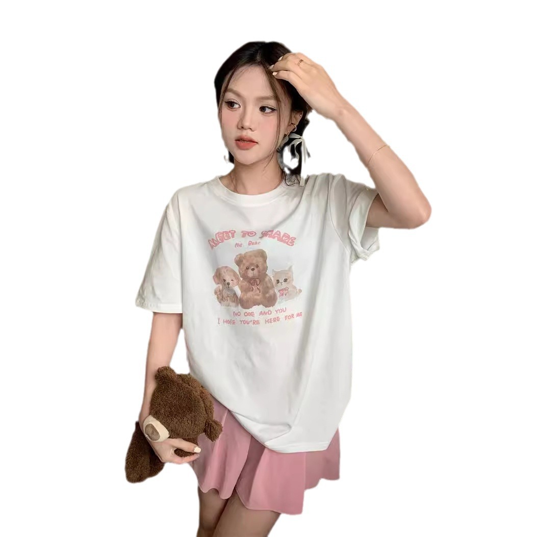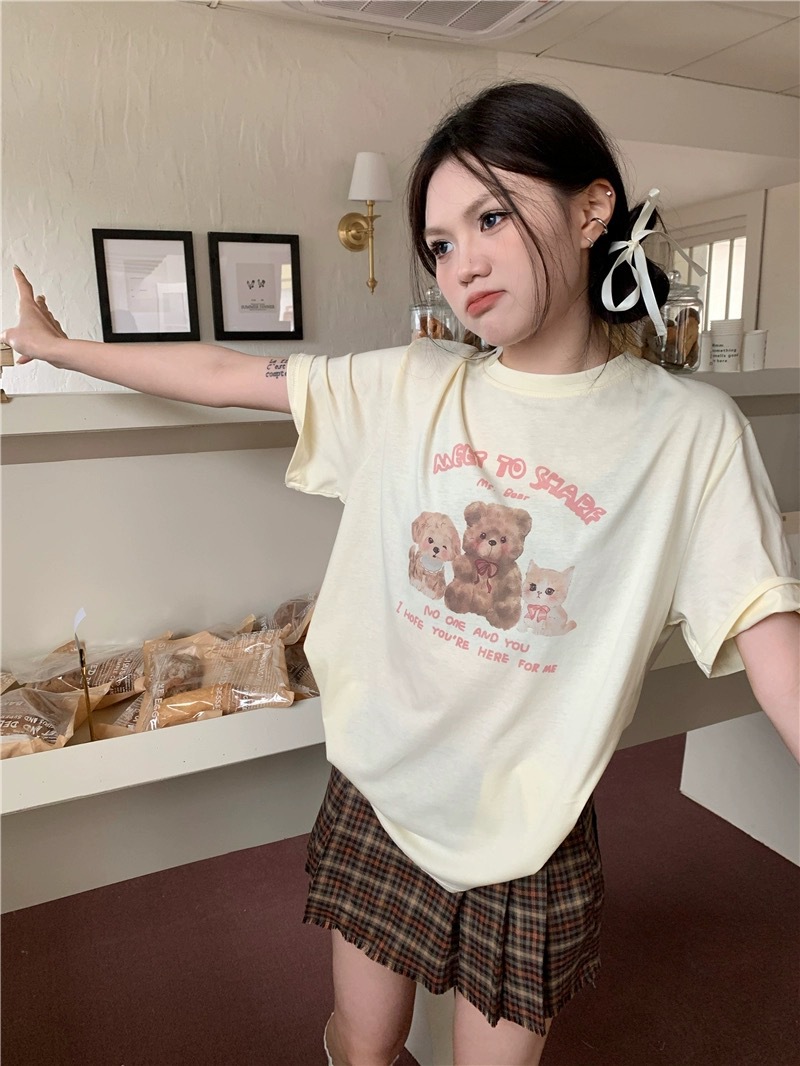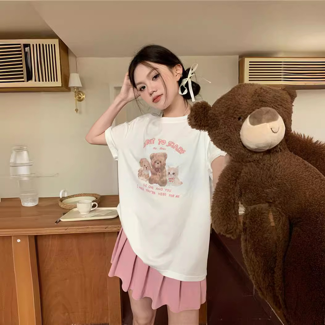 纯棉短袖t恤女夏日小熊穿搭设计感小众甜美宽松显瘦上衣潮流半袖