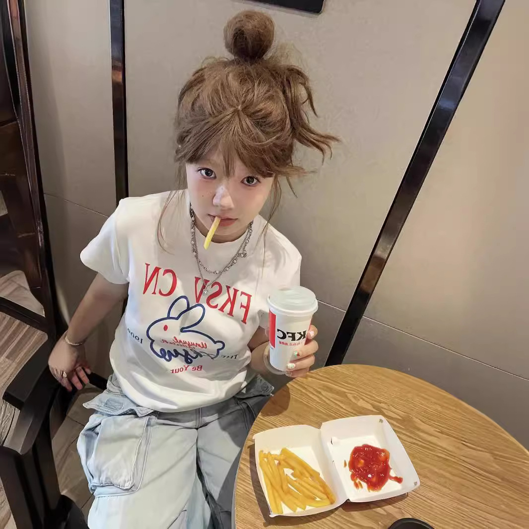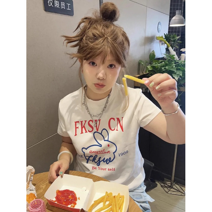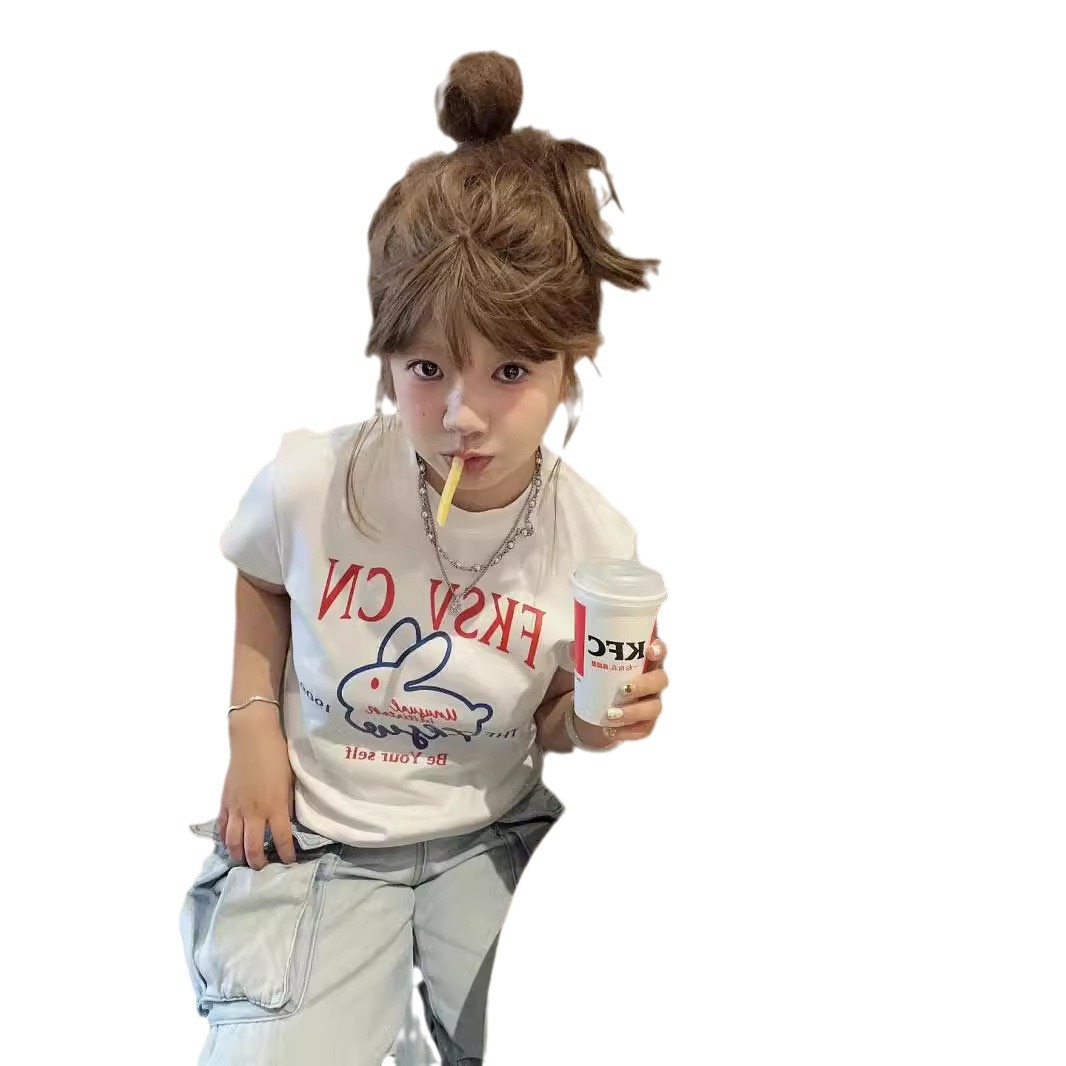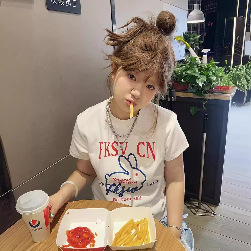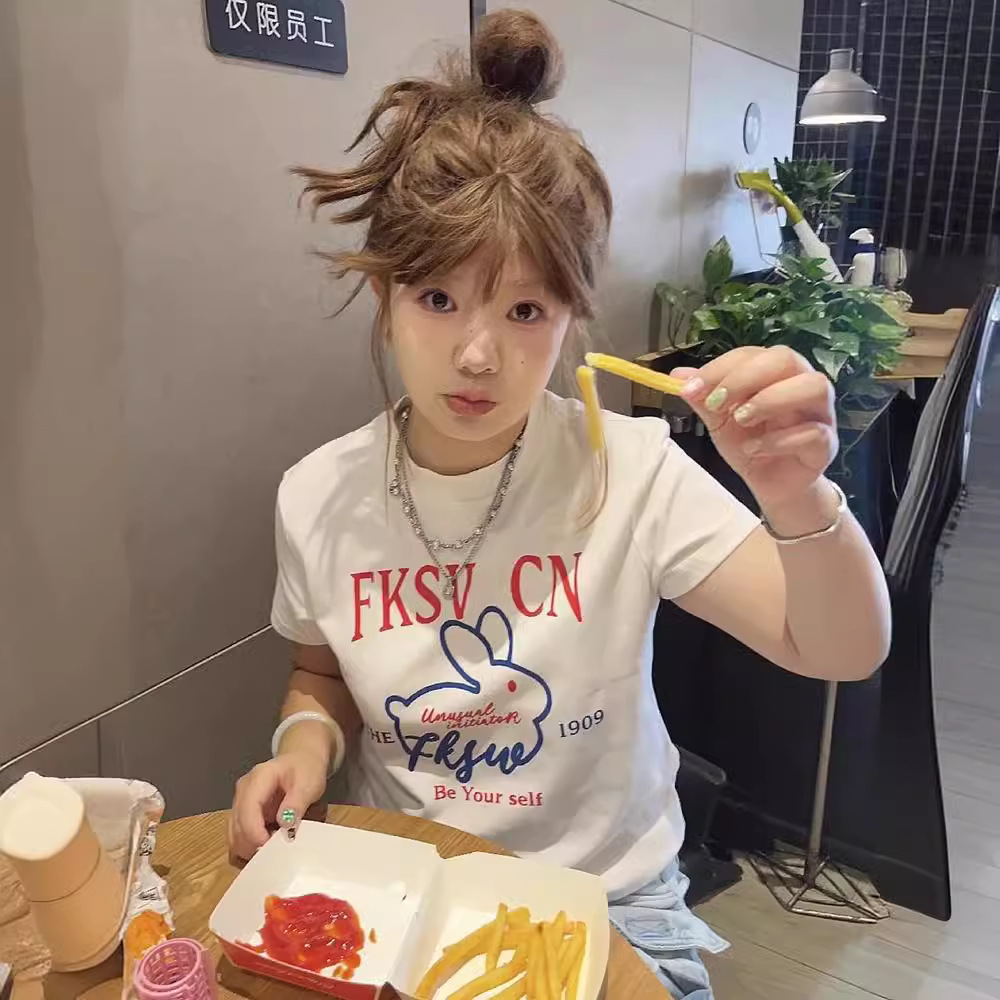 美式复古简约休闲正肩t恤女夏季新款甜美手绘兔子印花短袖上衣ins