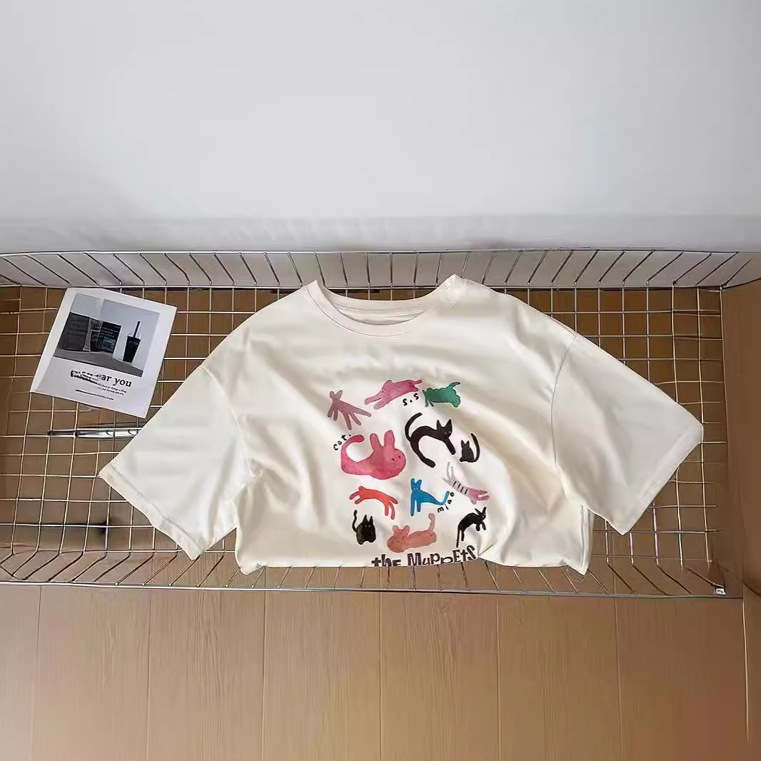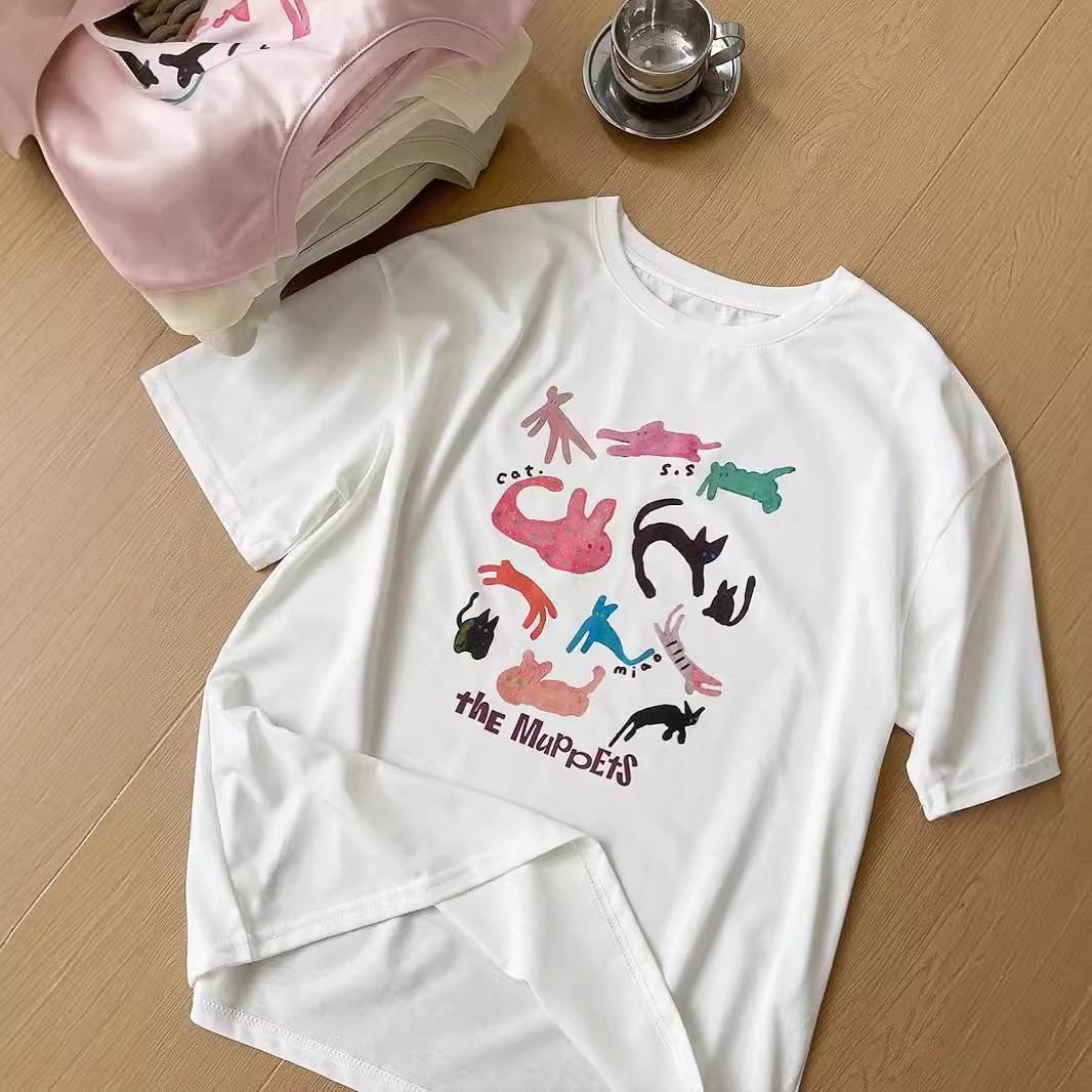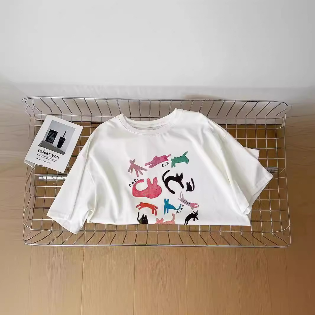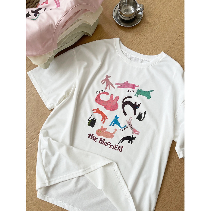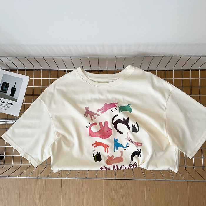 100%纯棉卡通印花韩版简约宽松圆领夏季舒适显瘦百搭短袖T恤女