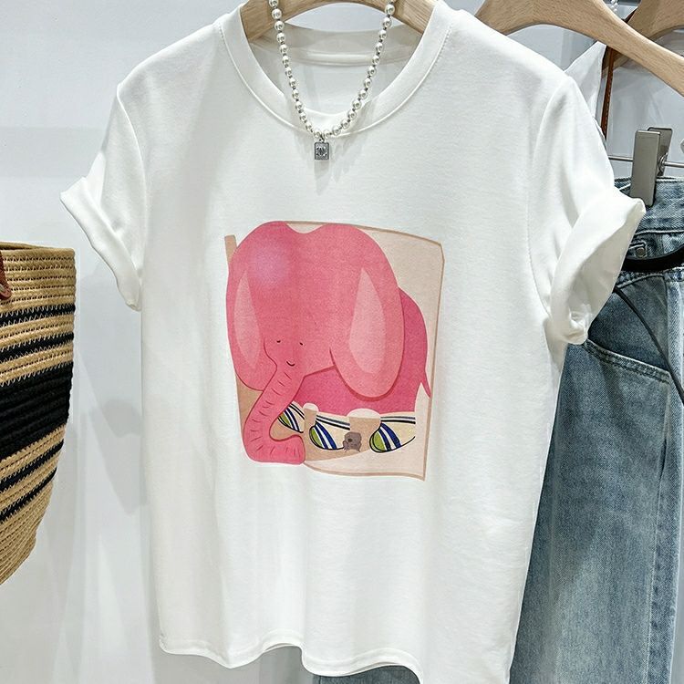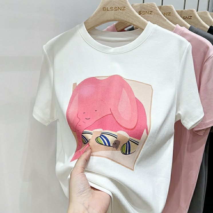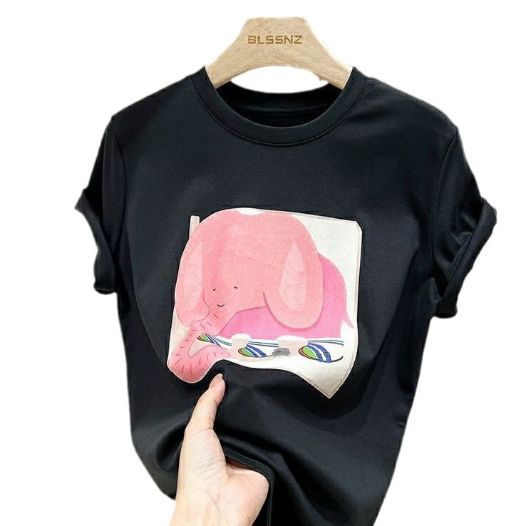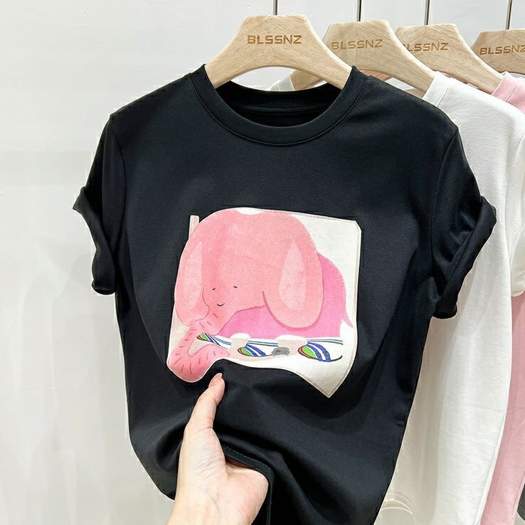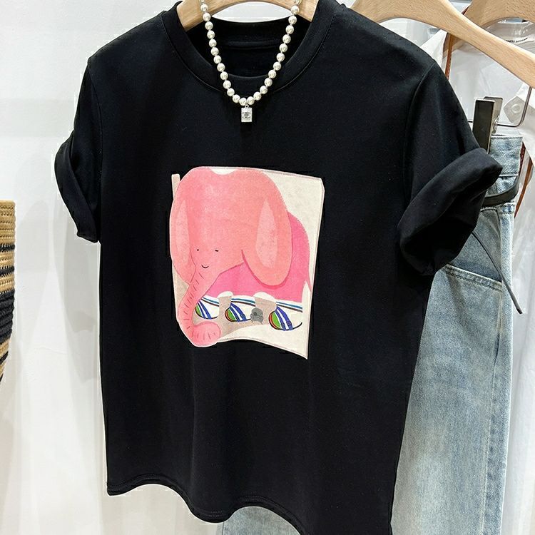 超手感莫代尔上衣卡通印花宽松t恤短袖女正肩设计感小众夏季韩版