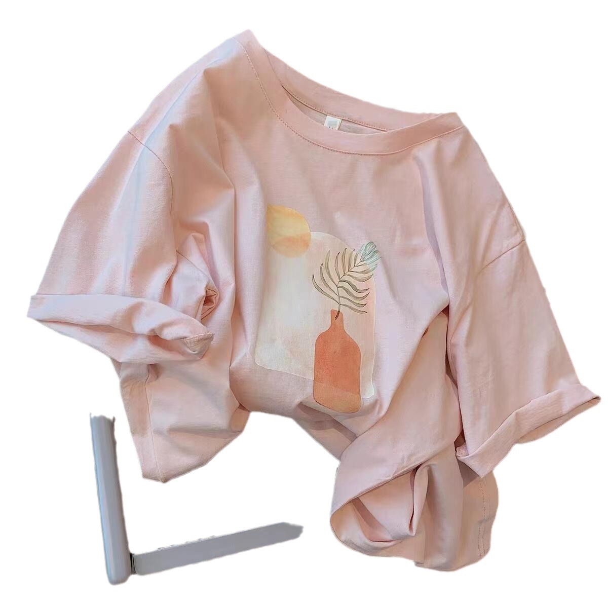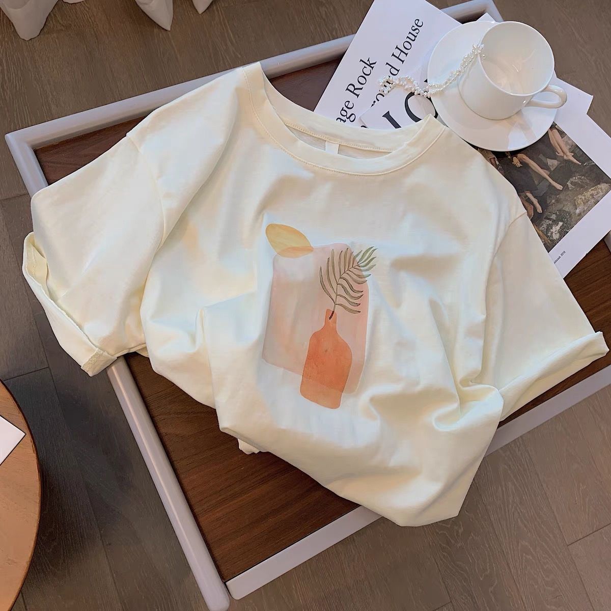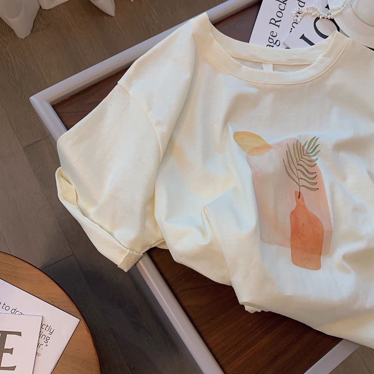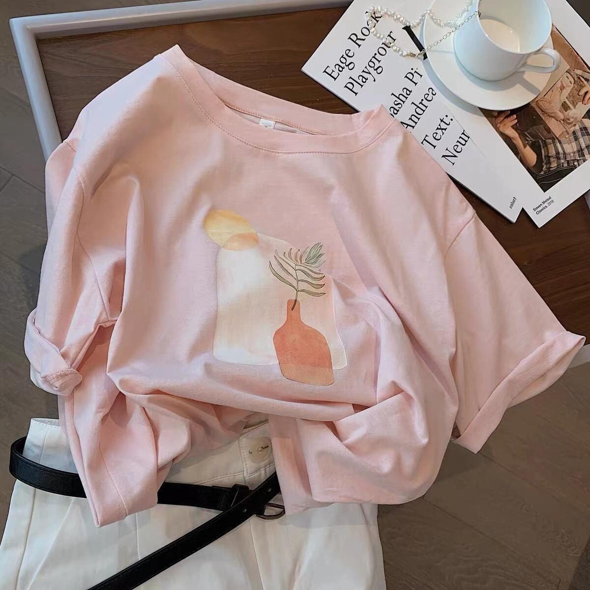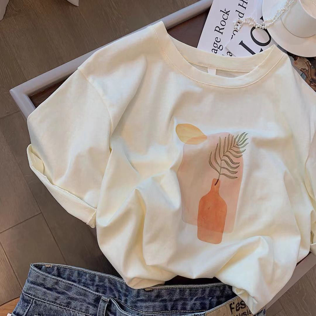 杏色油画印花莫代尔短袖t恤女夏季新款韩版宽松简约半袖体恤