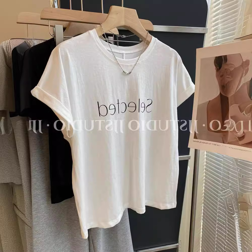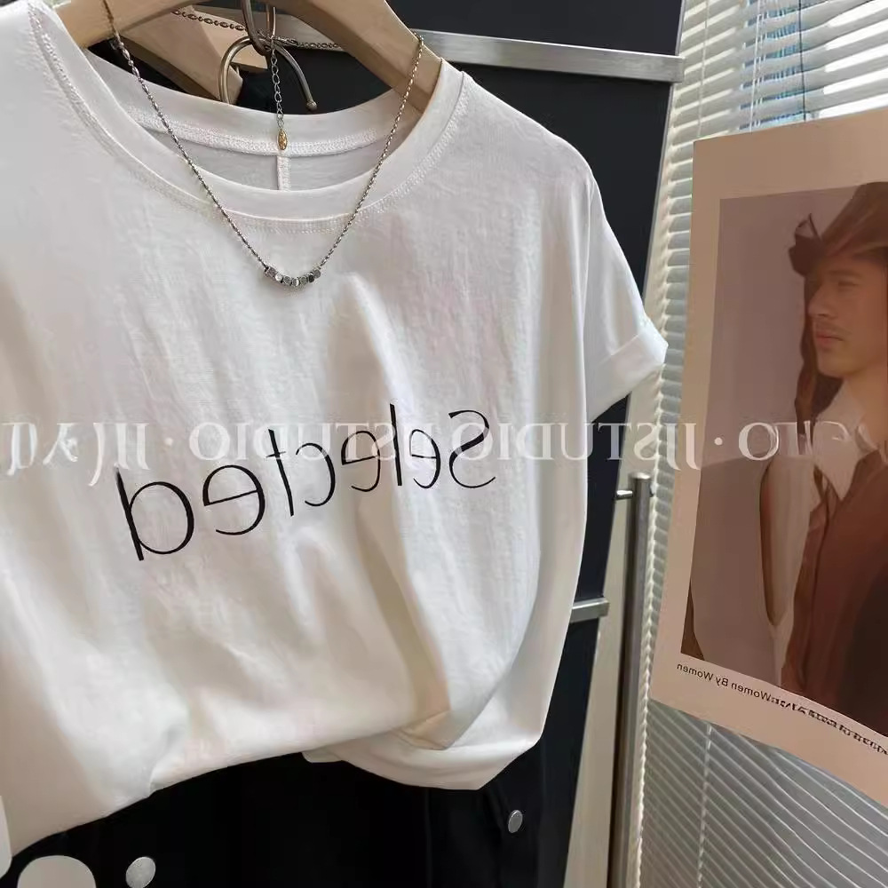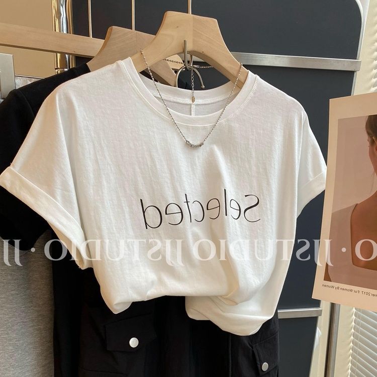 简约百搭字母印花白色短袖年夏季正肩T恤夏圆领宽松体恤上衣