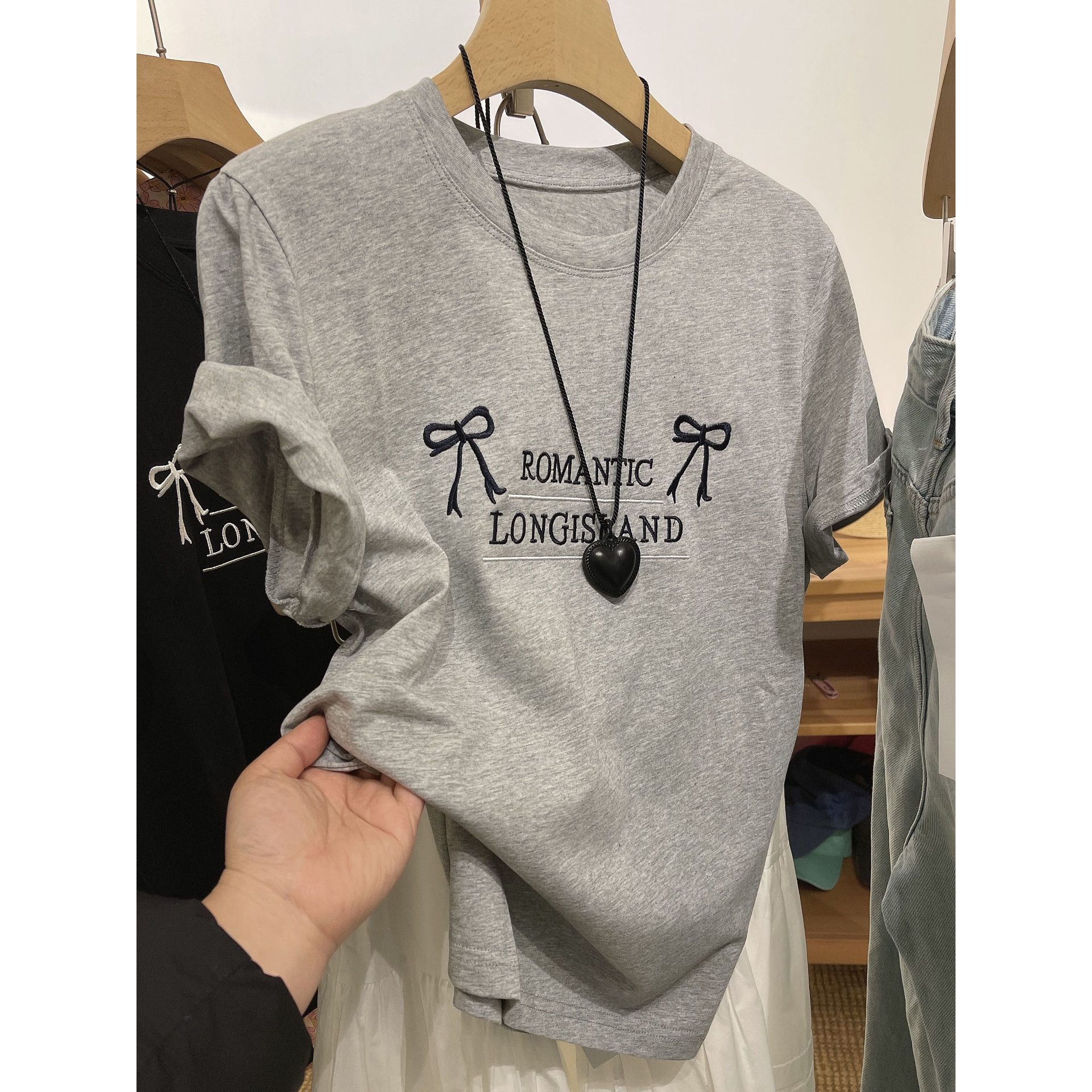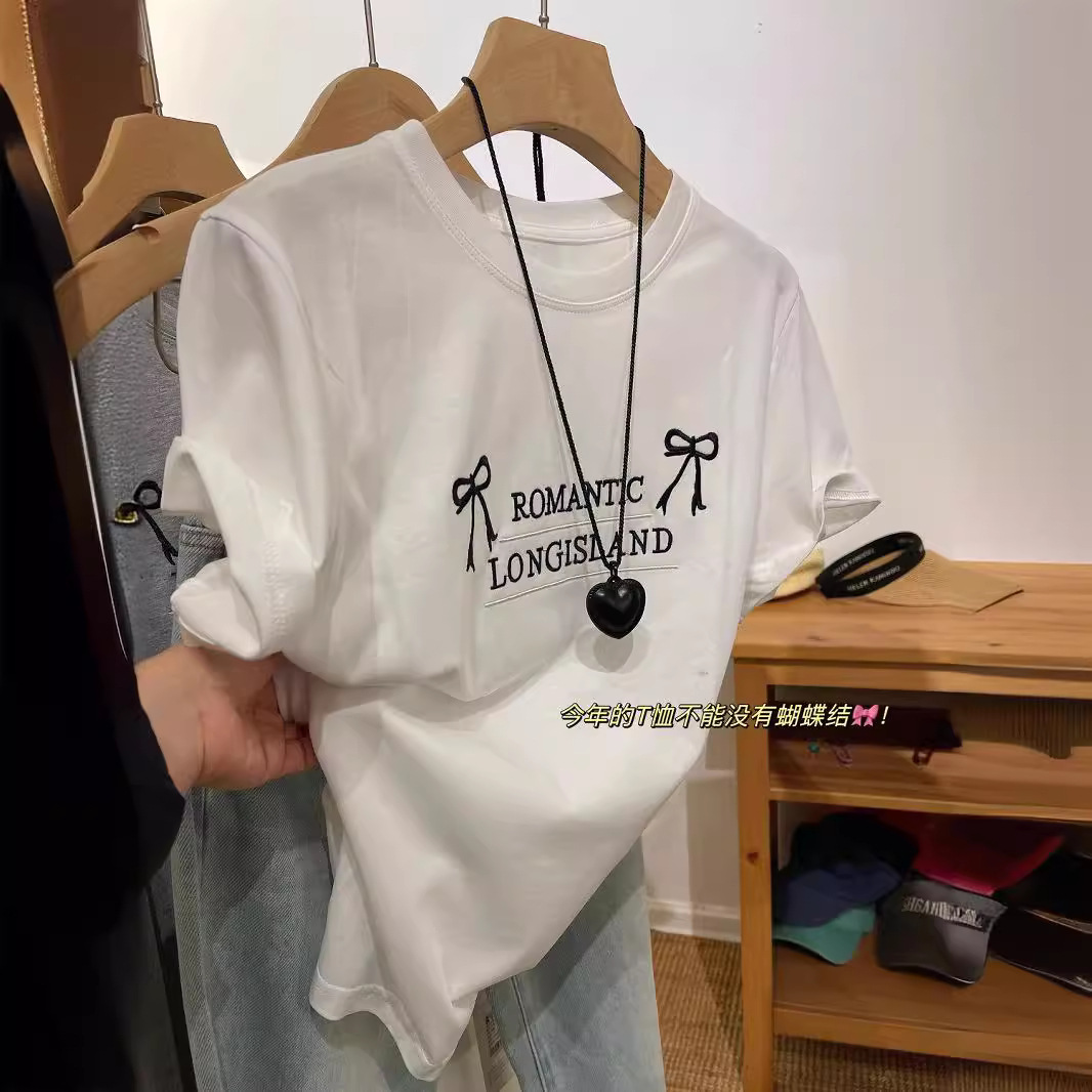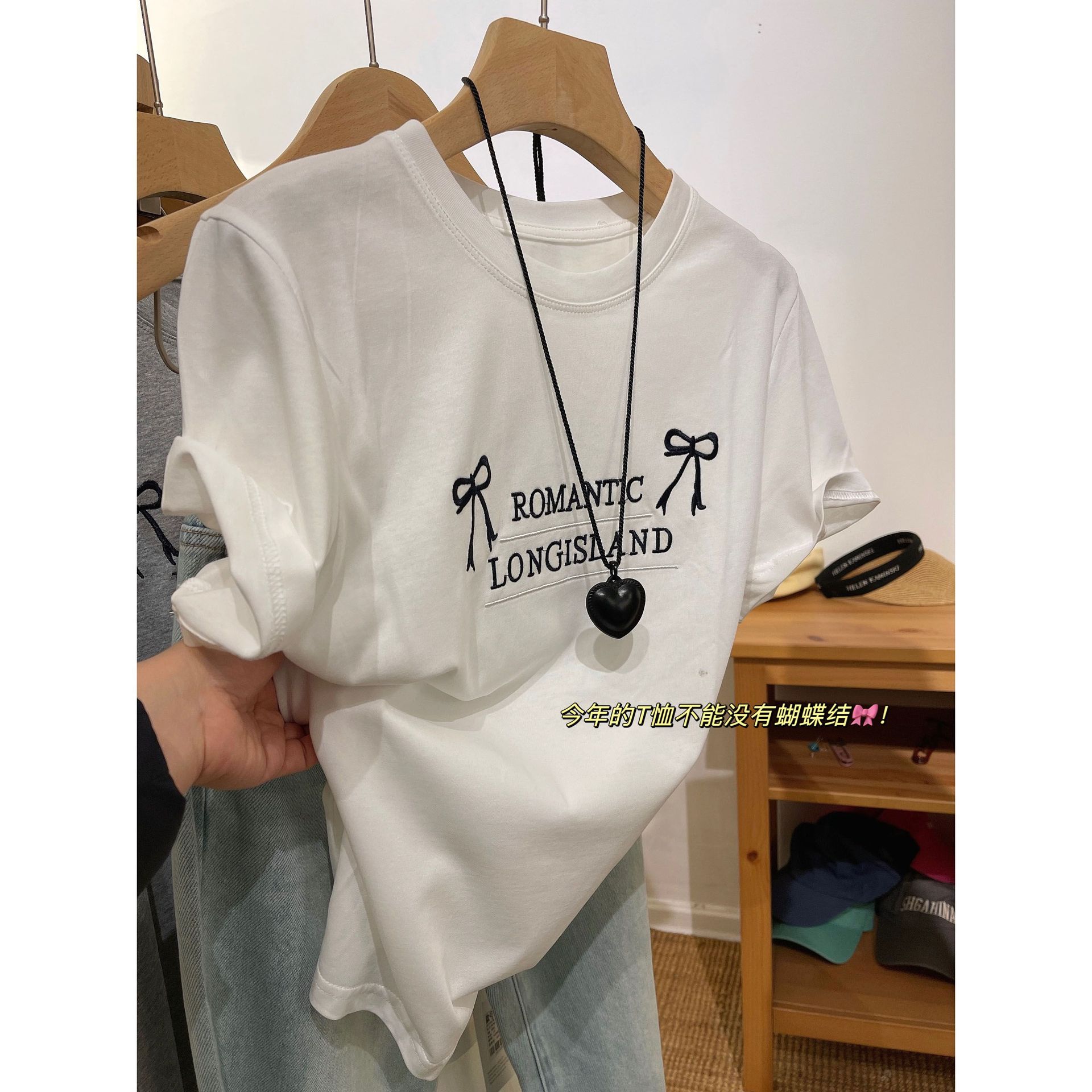 重工刺绣字母蝴蝶结莫代尔短袖T恤女夏季百搭宽松圆领套头上衣潮