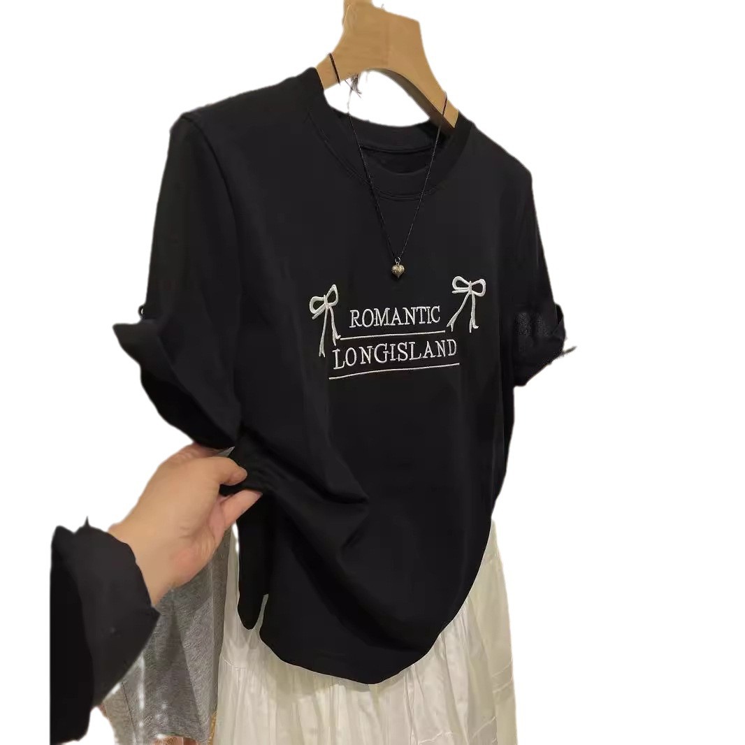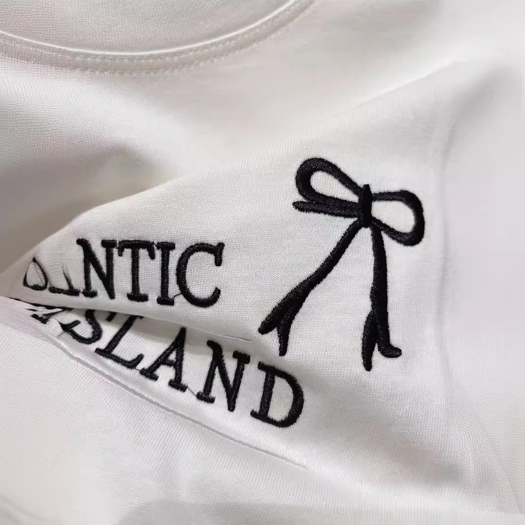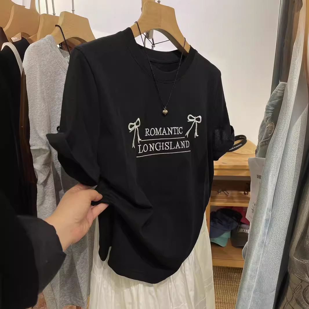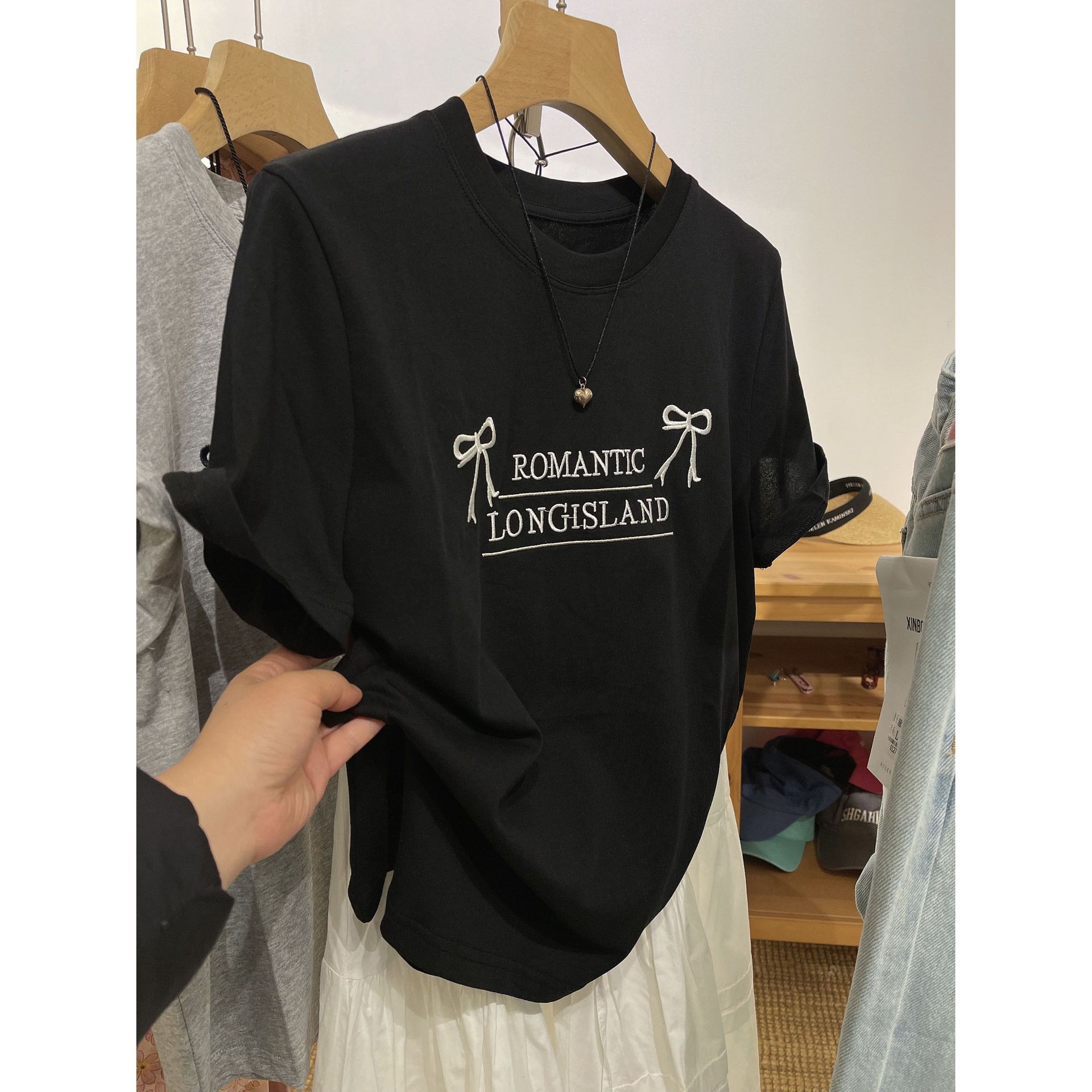 重工刺绣字母蝴蝶结莫代尔短袖T恤女夏季百搭宽松圆领套头上衣潮