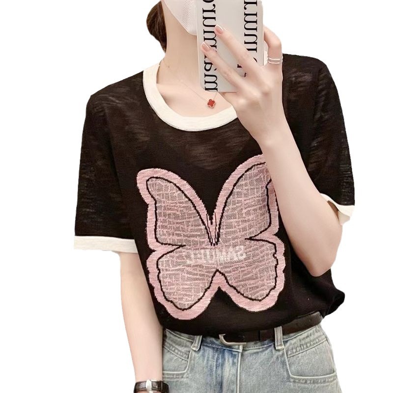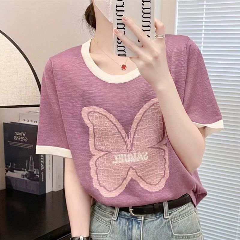 今年流行字母蝴蝶减龄冰丝体恤衫夏季女款撞色圆领轻薄短袖上衣潮