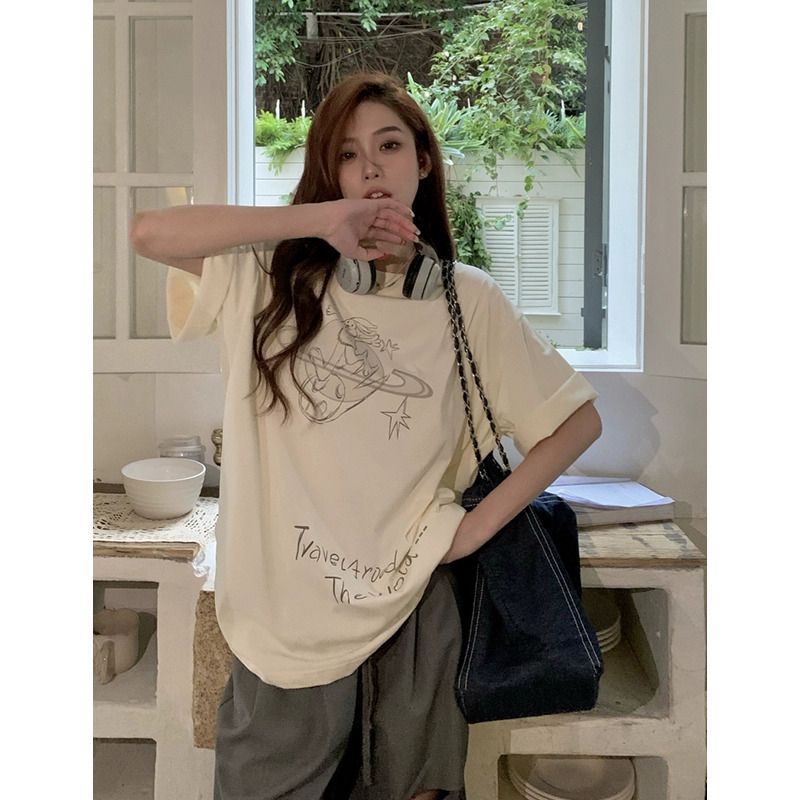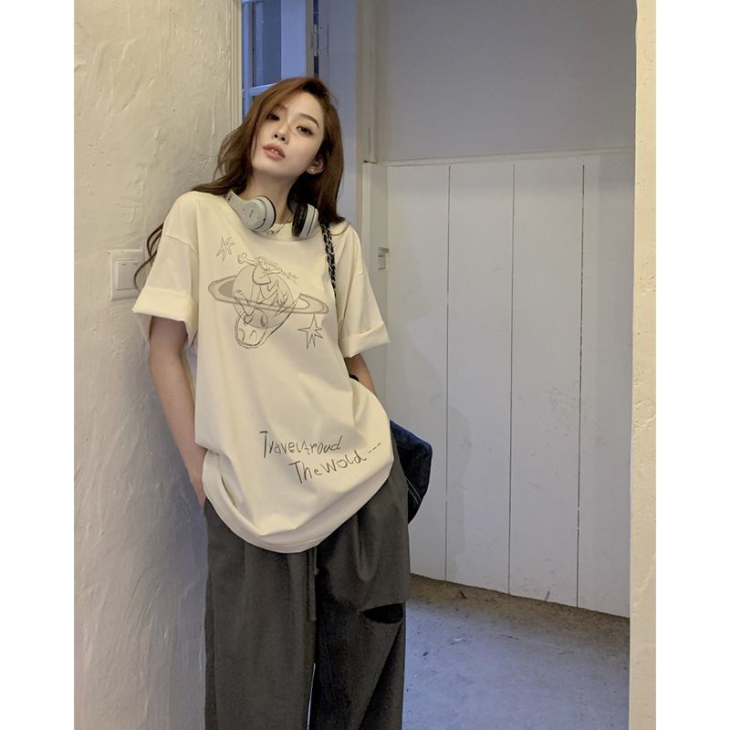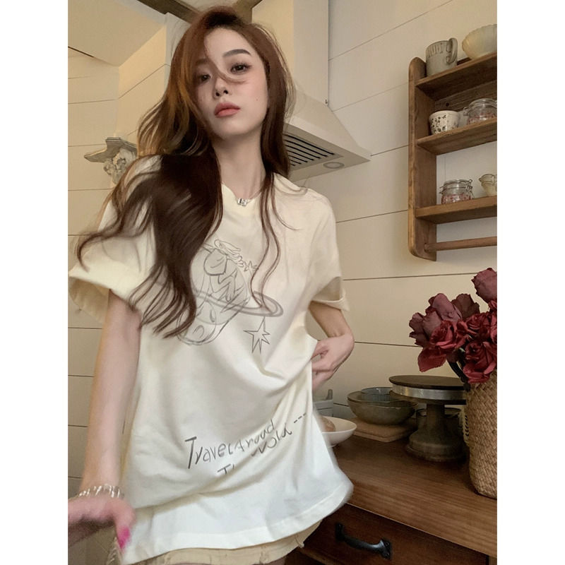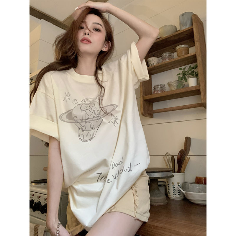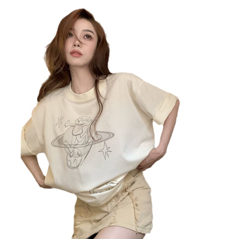 杏色兔子印花短袖T恤女夏季薄款韩系设计感小众宽松港味上衣
