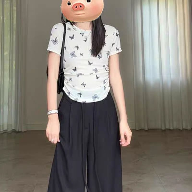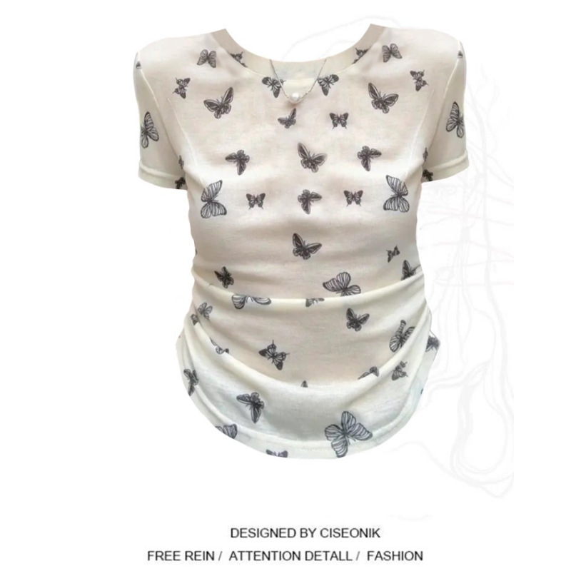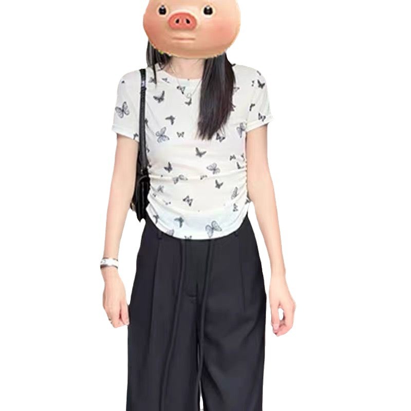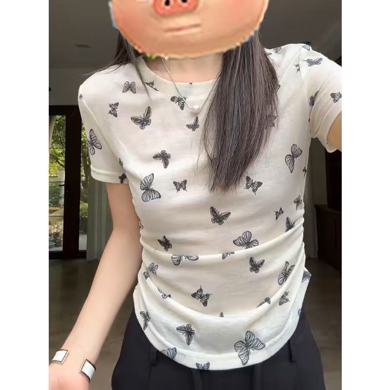 蝴蝶正肩印花圆领夏季修身纯欲T恤设计显瘦打底短款短袖上衣
