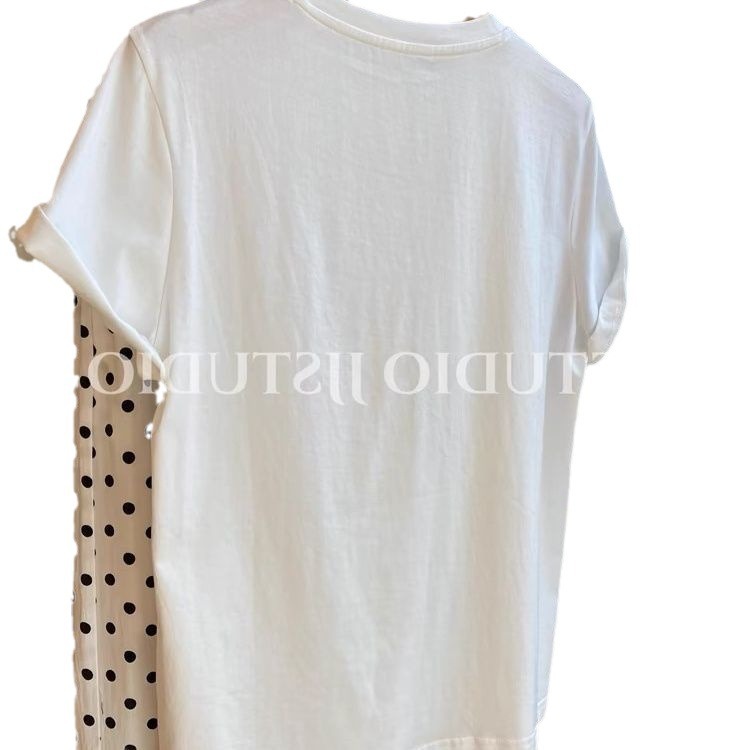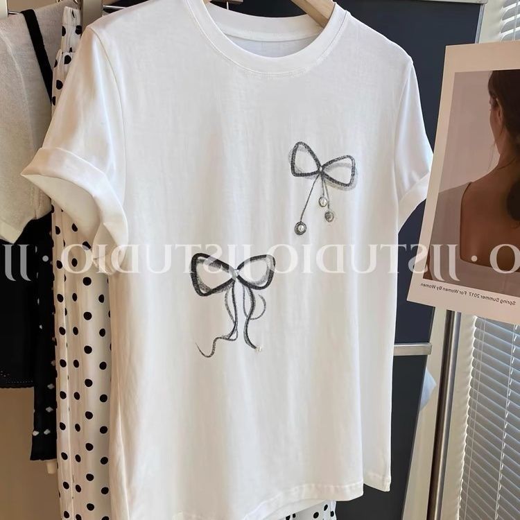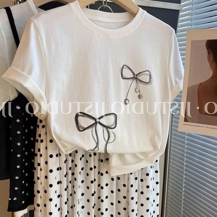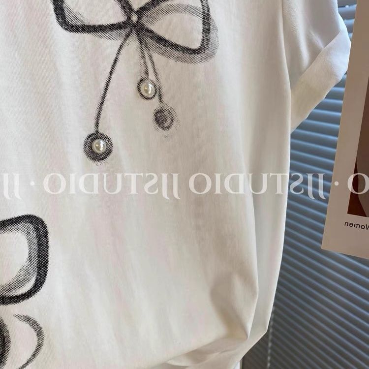 韩版蝴蝶结印花钉珠正肩短袖t恤女夏季白色内搭圆领宽松体恤上衣
