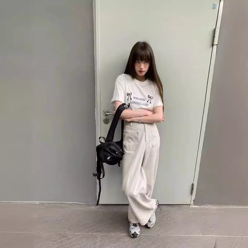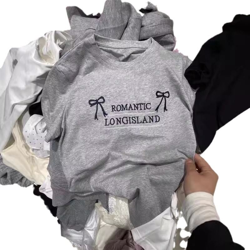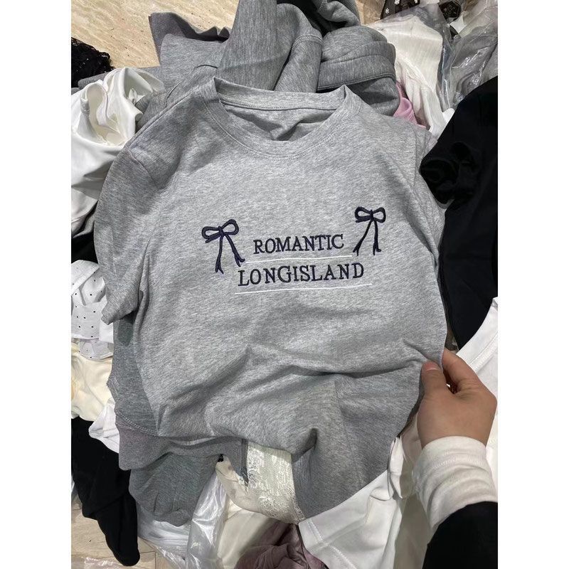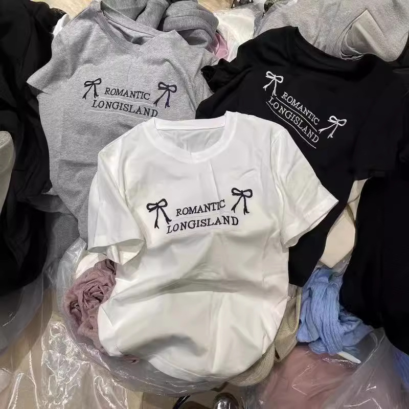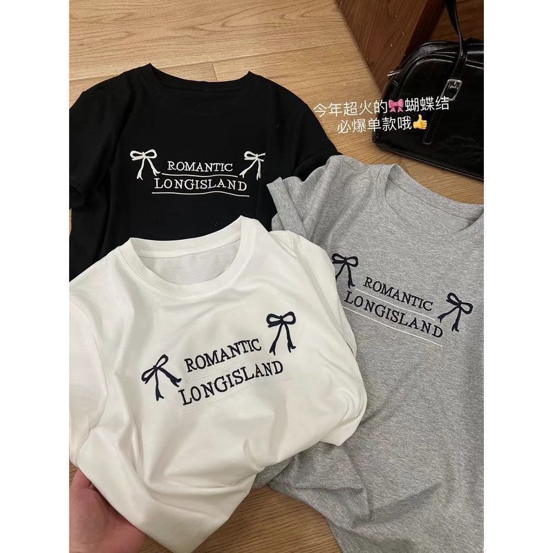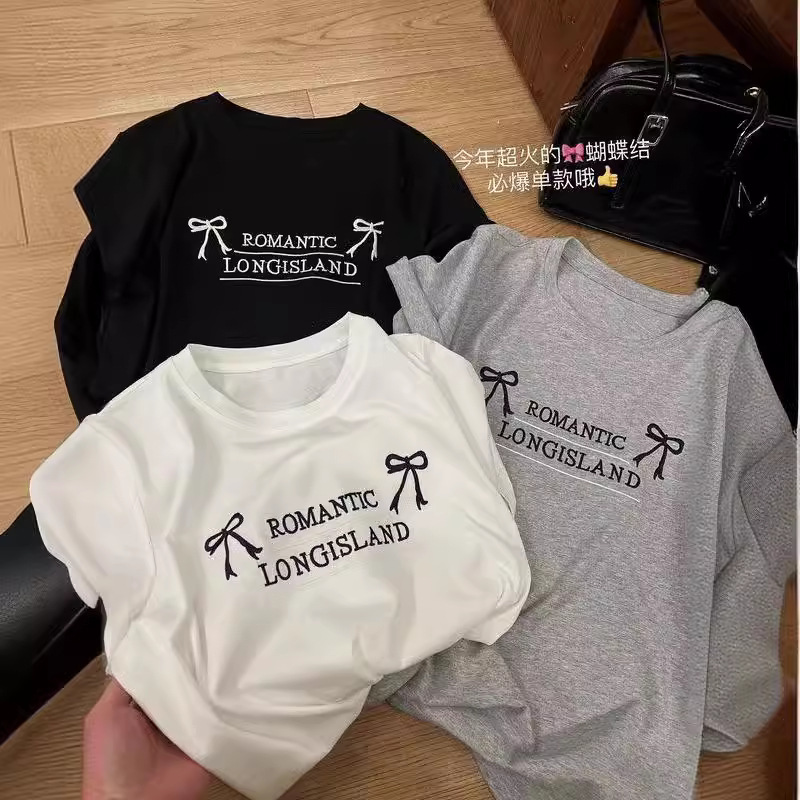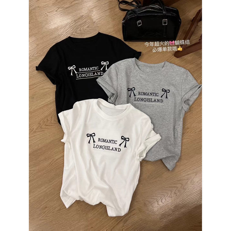莫代尔短袖刺绣蝴蝶结T恤女夏季简约休闲美式字母印花上衣服