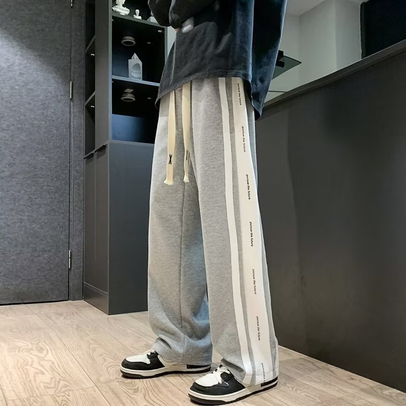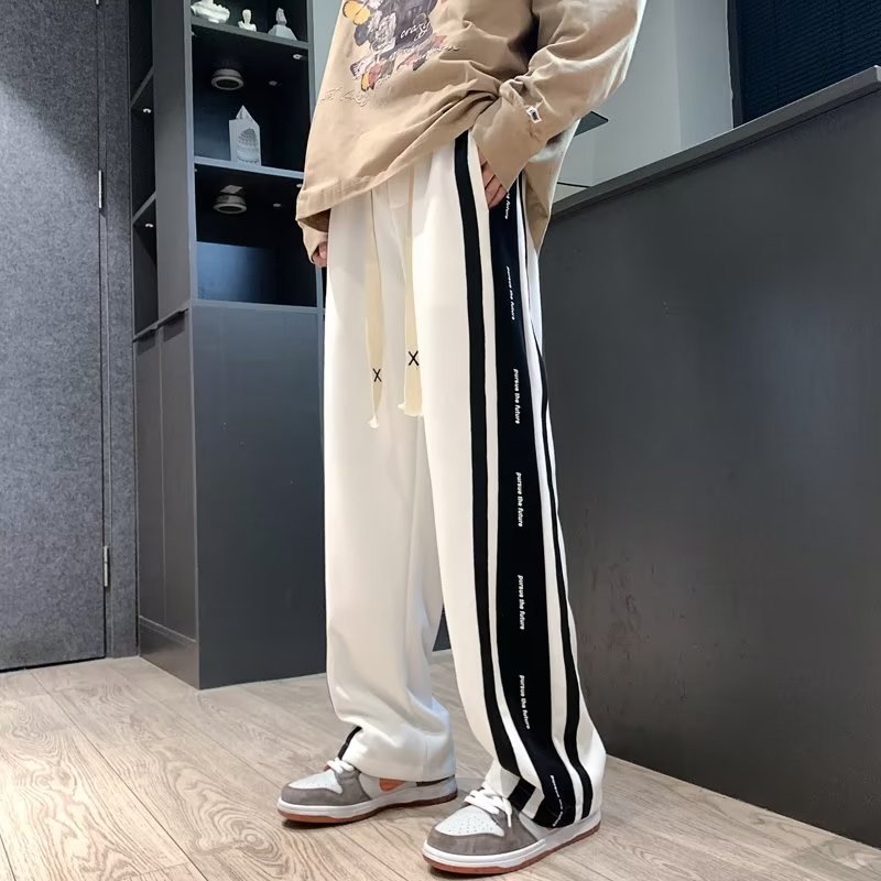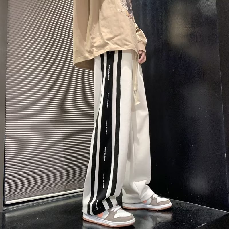 休闲卫裤男直夏季条纹筒宽松春秋情侣新款垂坠感阔腿男生运动裤子
