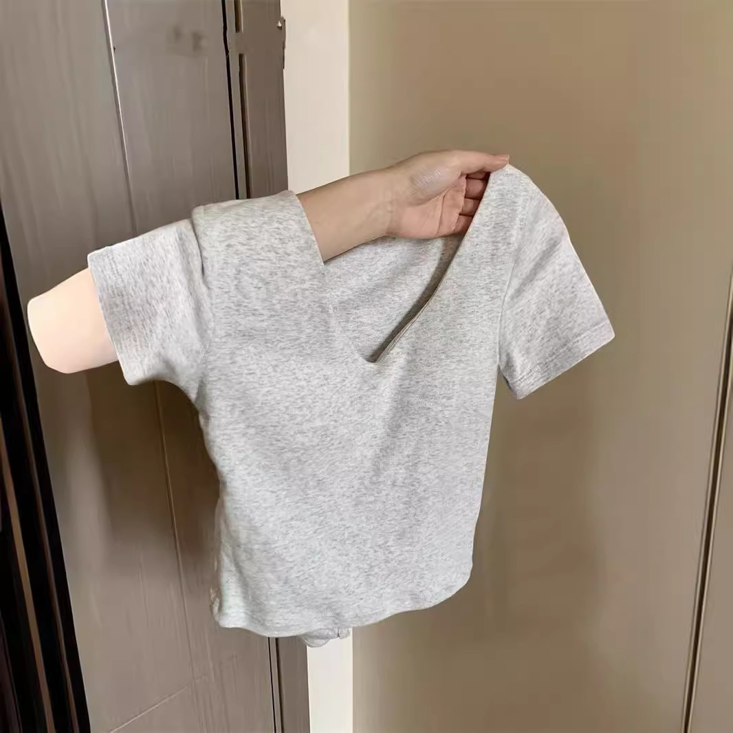 美式正肩v领短袖t恤女夏季绑带露背设计感打底衫露腰短款上衣