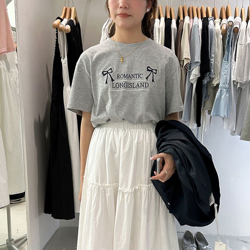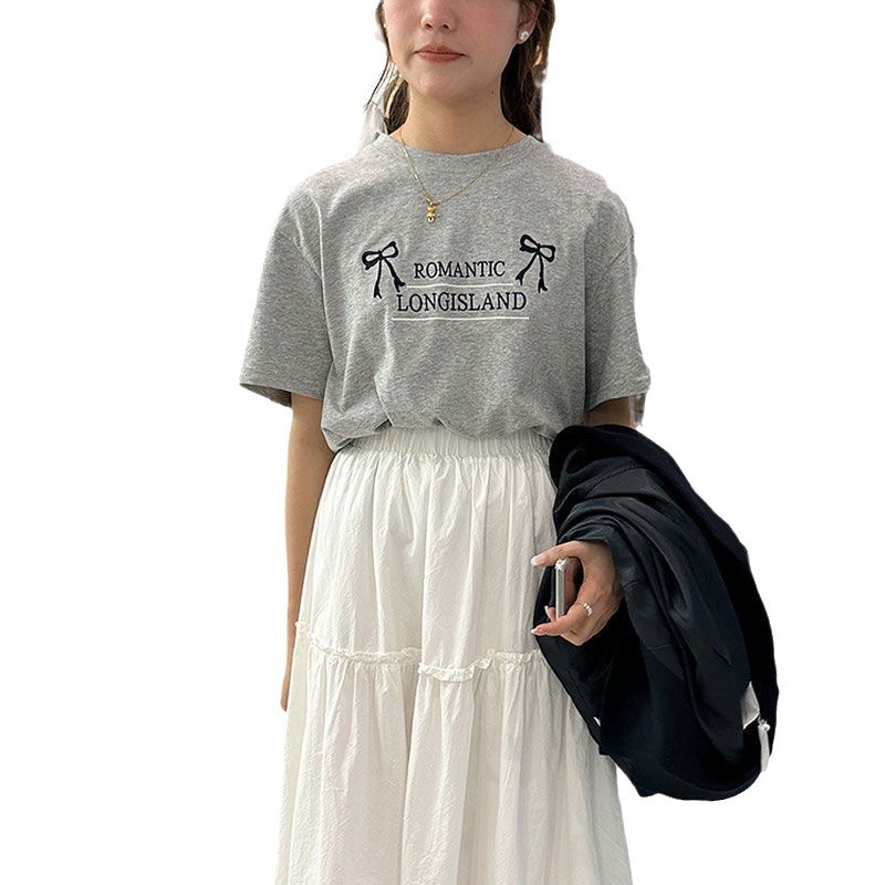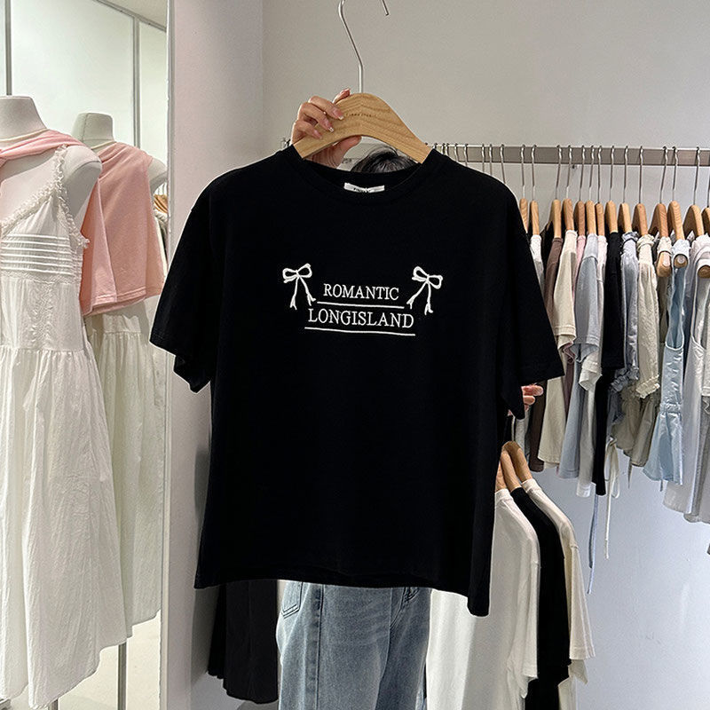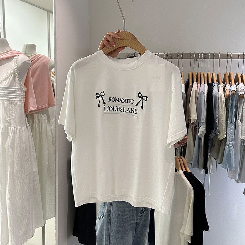 十三行女装新款简约蝴蝶结刺绣T恤女夏休闲美式字母印花上衣