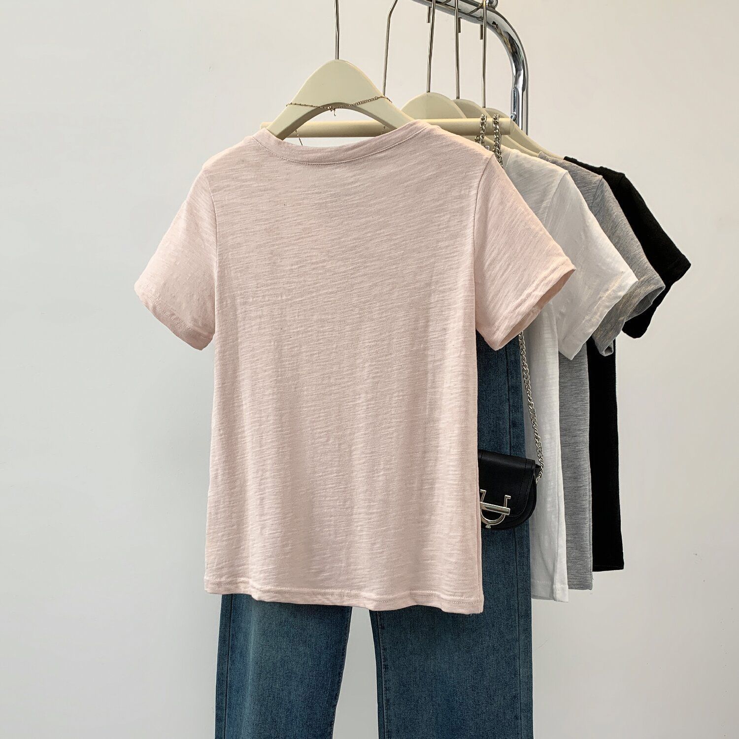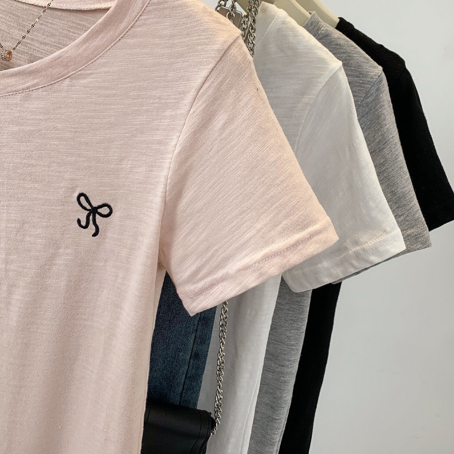 100%竹节棉桃心领短袖t恤女夏季蝴蝶结刺绣修身显瘦体恤上衣