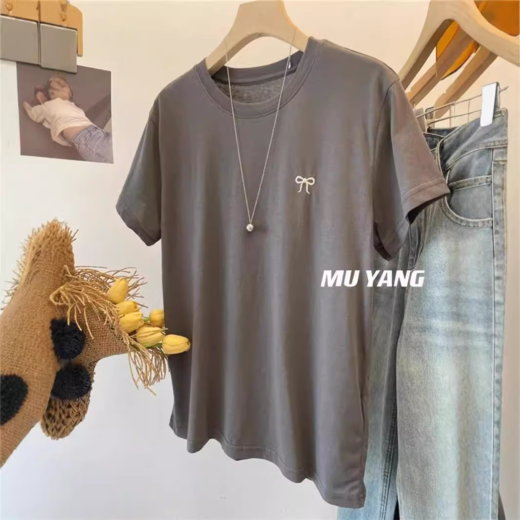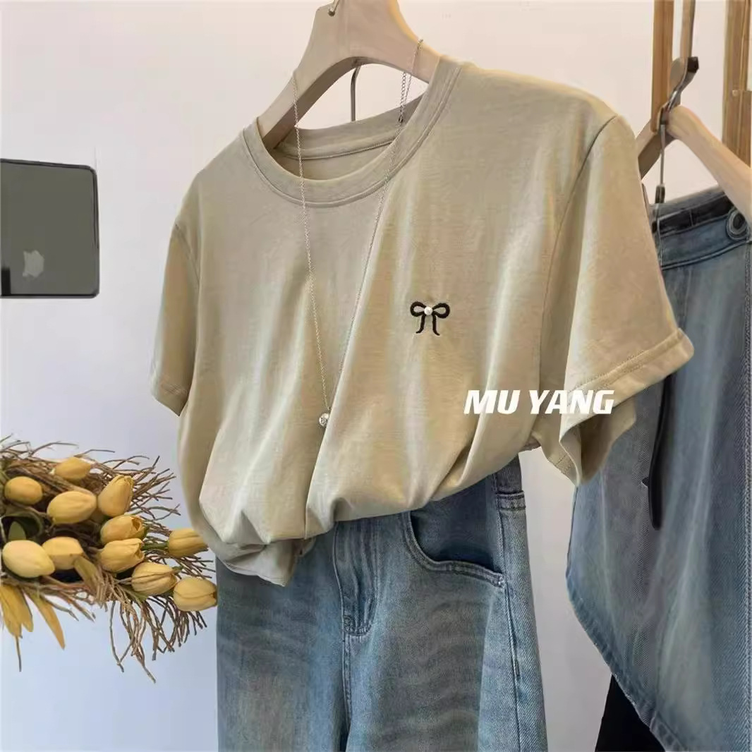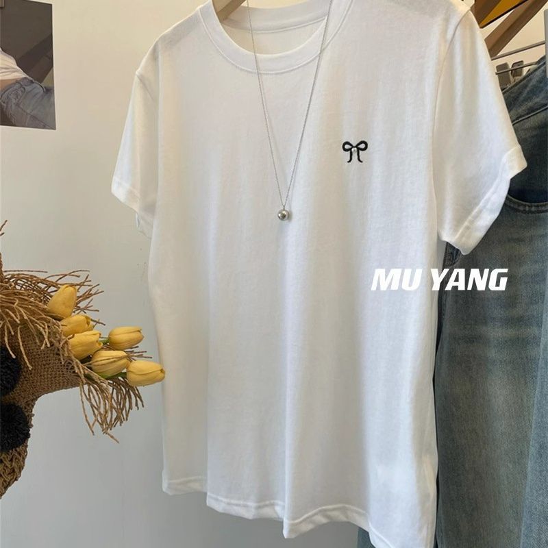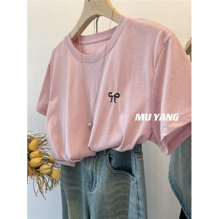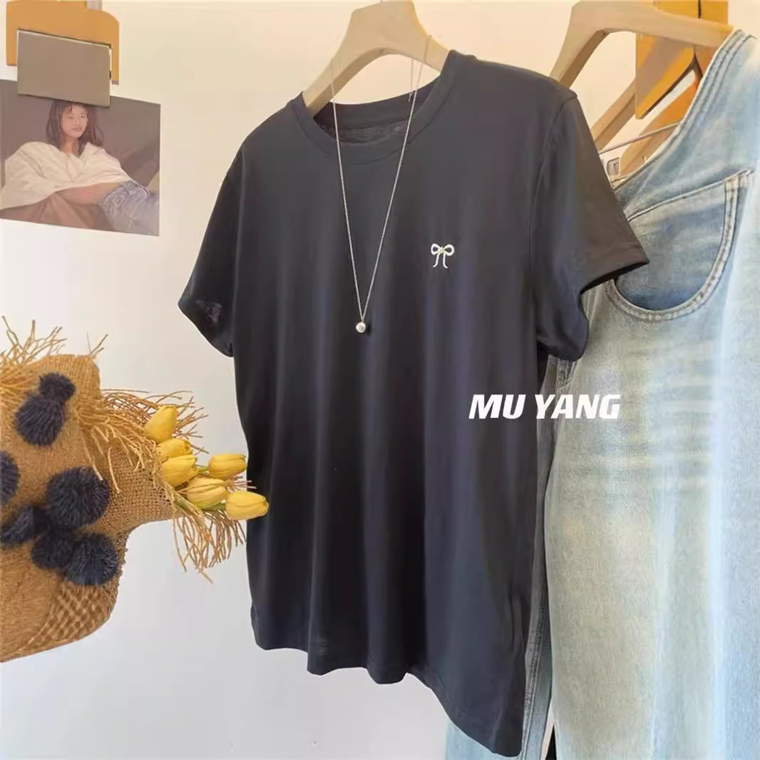 穿一夏!5色短袖T恤女柔软薄款刺绣蝴蝶结上衣休闲圆领百搭上衣潮