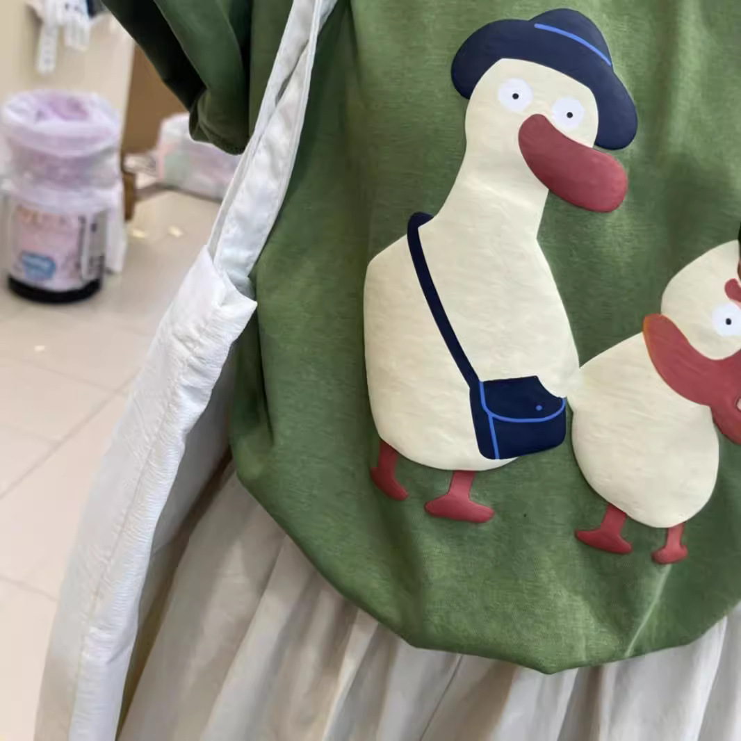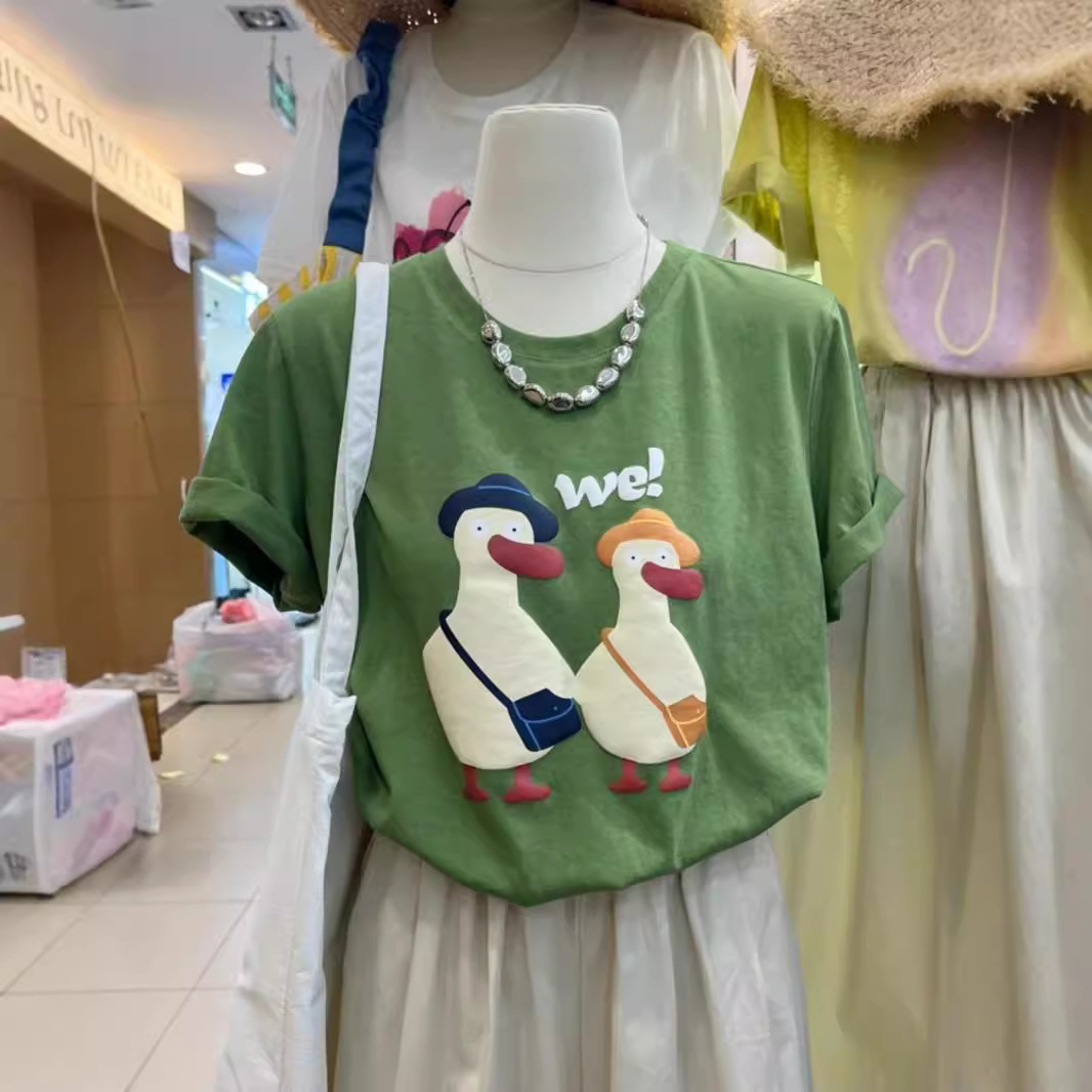 夏季新品韩版圆领宽松百搭气质鸭子洋气印花短袖T恤女小清新上衣