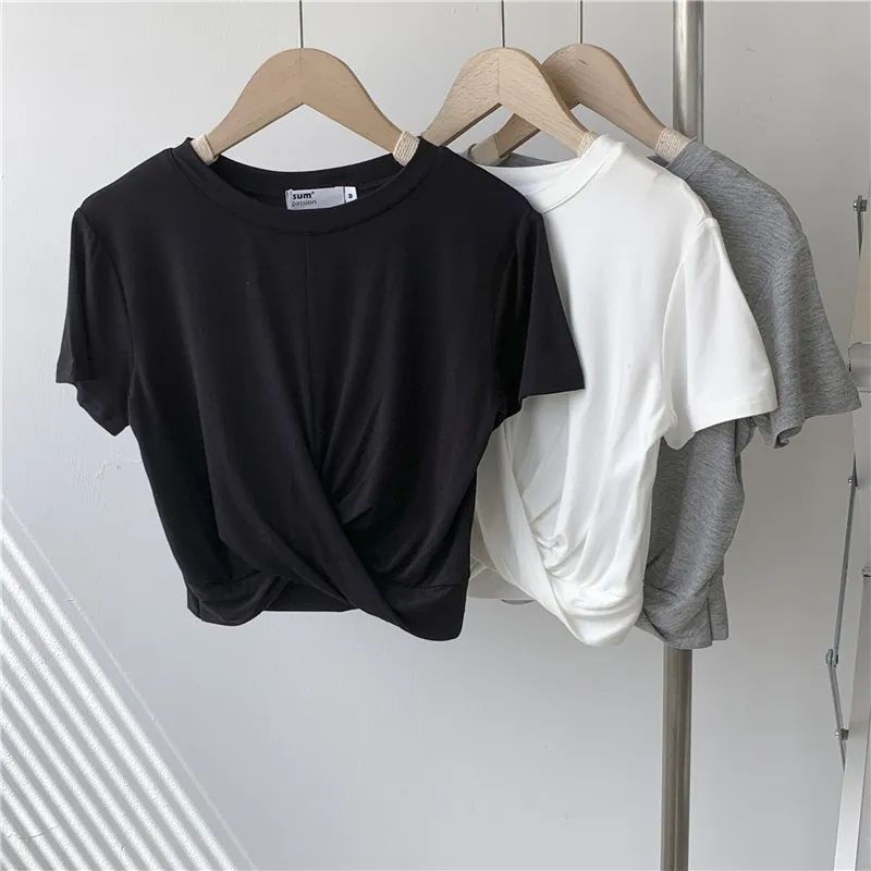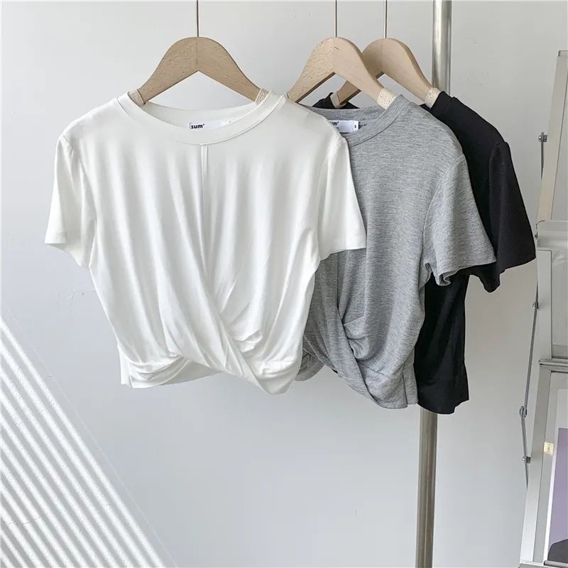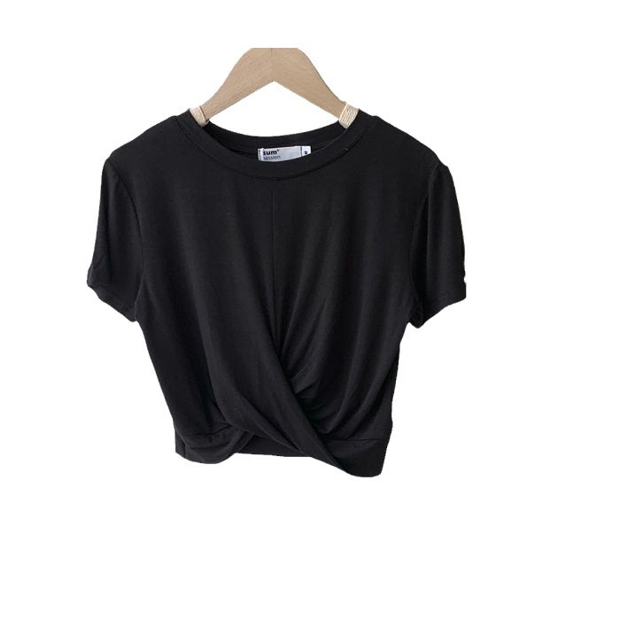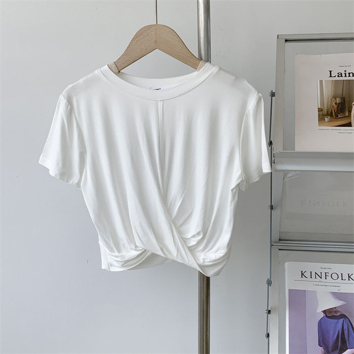 莫代尔打结短款t恤女个性夏季薄款露脐短袖纯色上衣女修身显瘦T恤