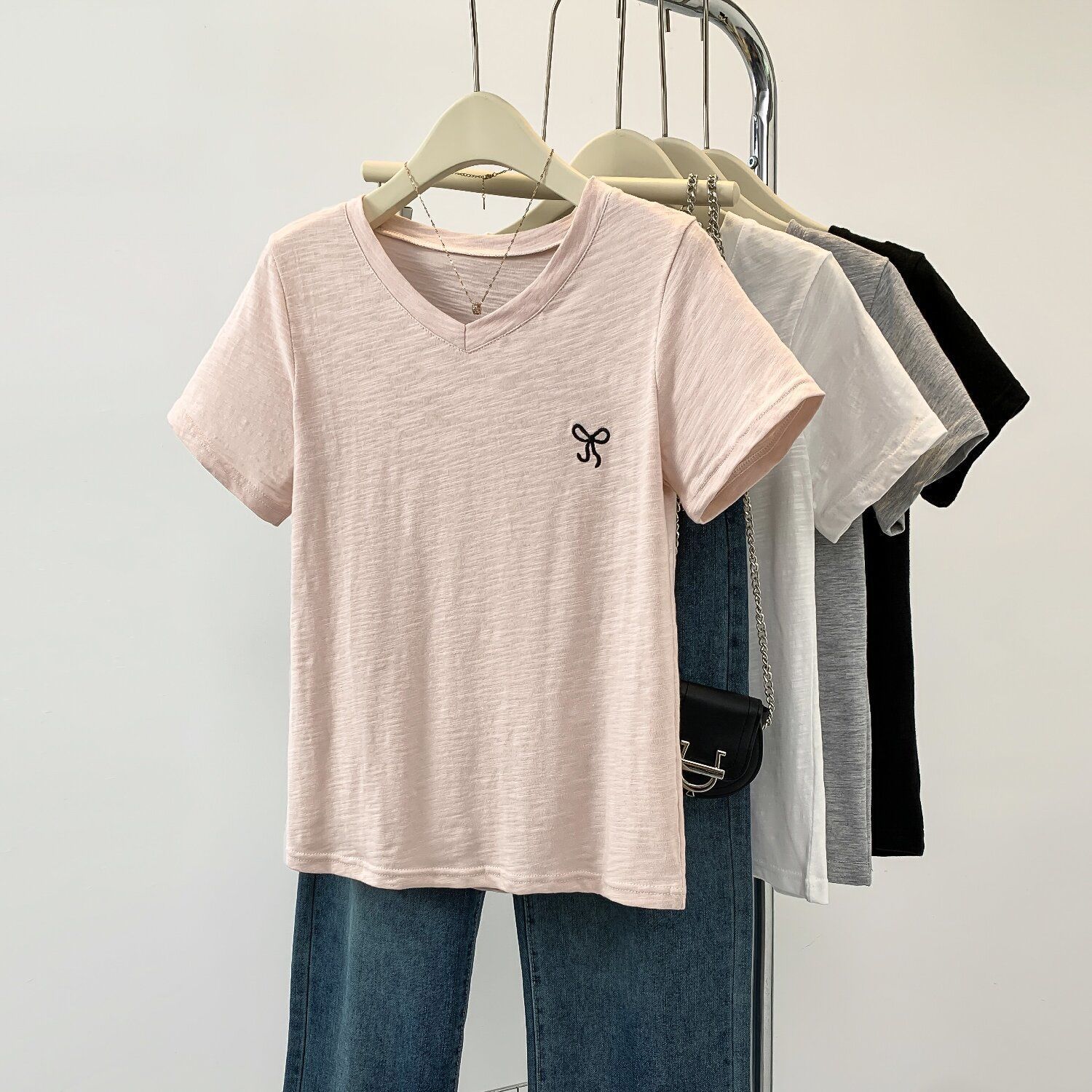 100%竹节棉桃心领短袖t恤女夏季蝴蝶结刺绣修身显瘦体恤上衣
