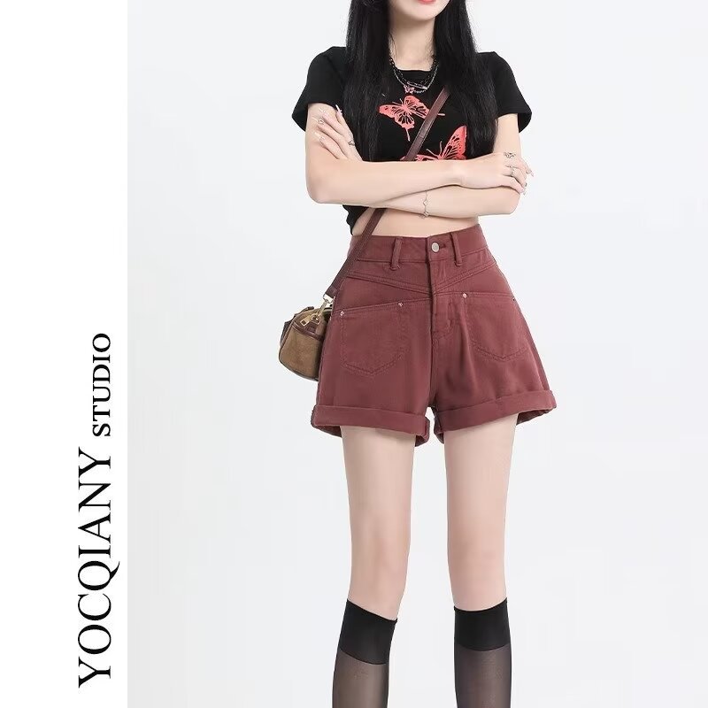 酒红色牛仔短裤女夏甜辣美式韩版大码胖mm高腰显瘦遮肉休闲热裤
