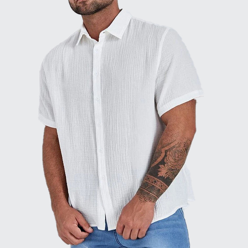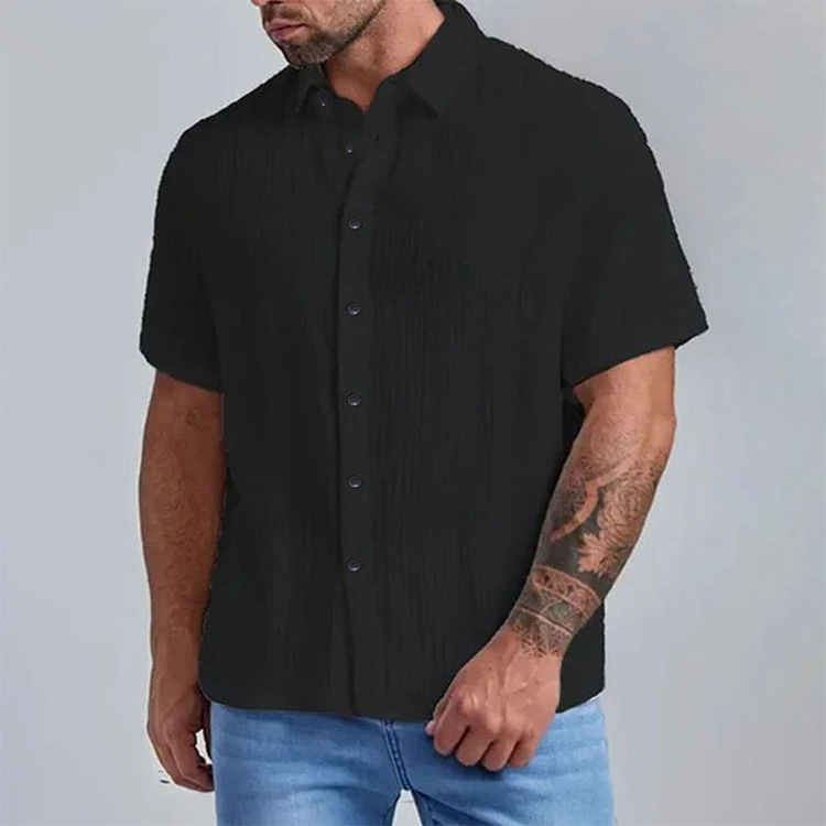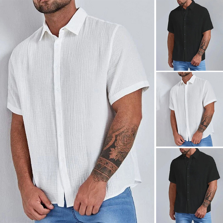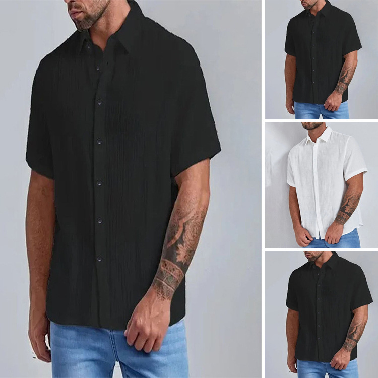 男棉麻时尚纯色双层皱欧美短袖衬衫夏时尚简约多色衬衣