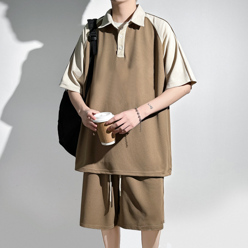 针织POLO衫短袖男套装夏季潮流翻领t恤短裤一套休闲运动潮两件装