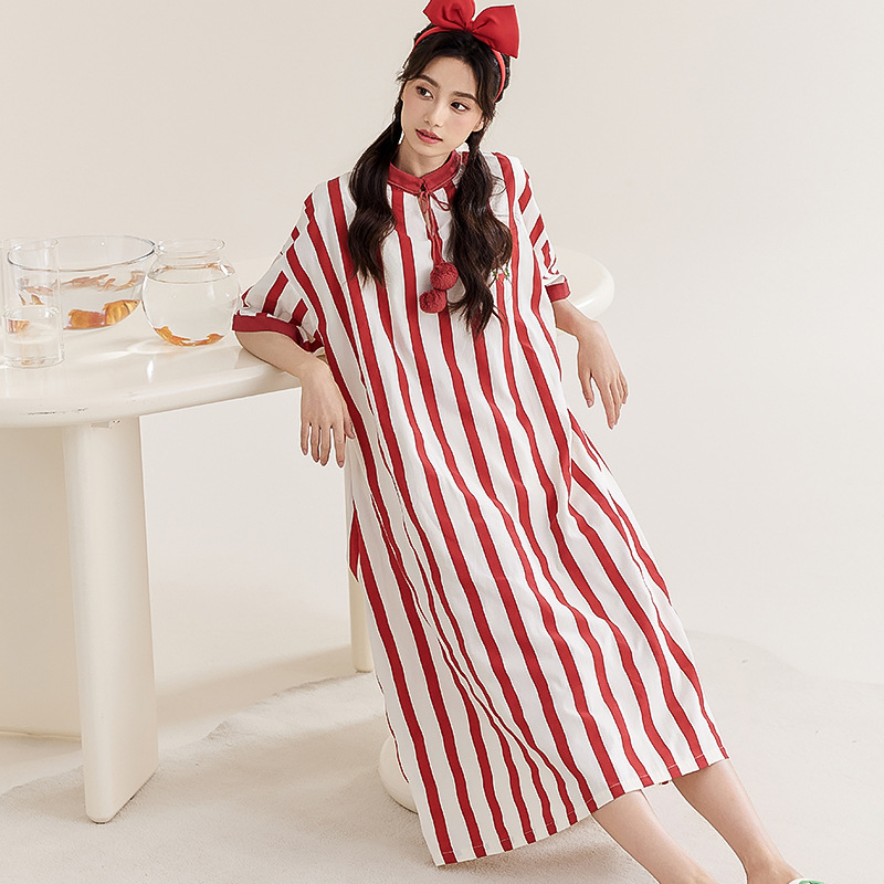 春夏新款魔法师红白条纹短袖睡裙简约休闲中长款家居睡裙可外穿