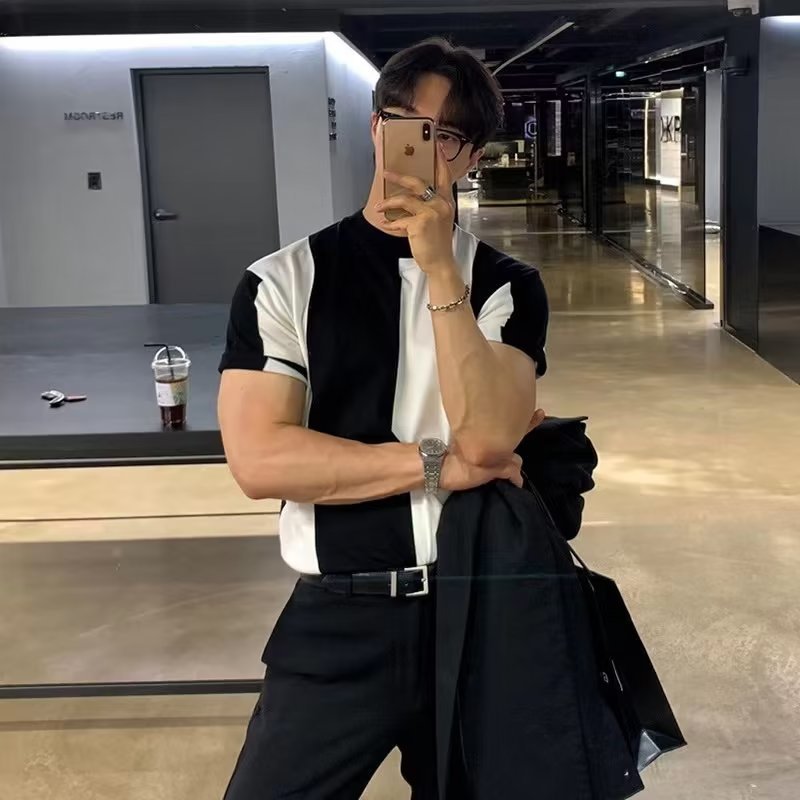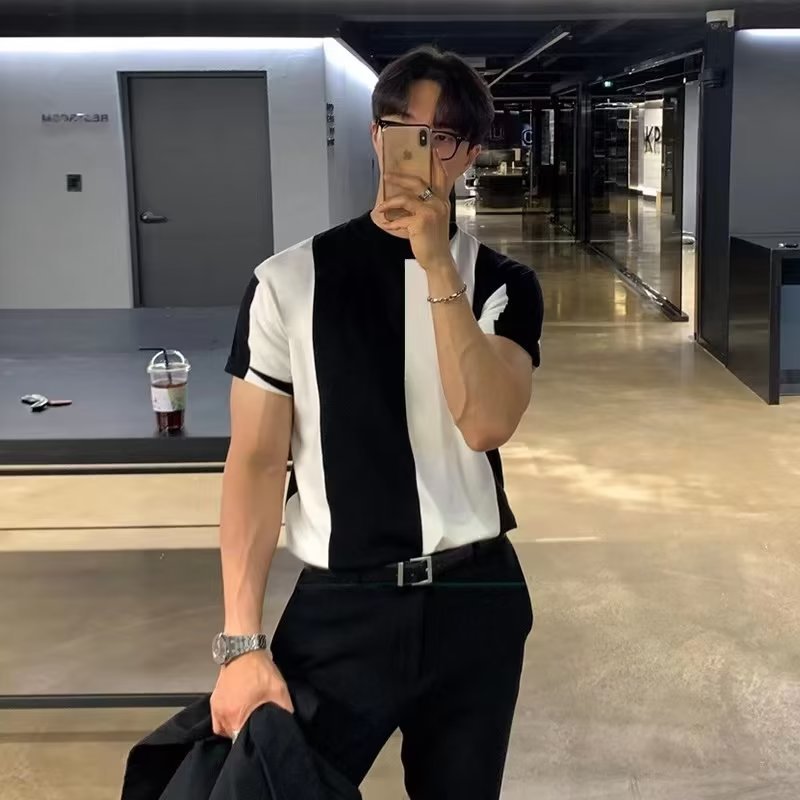 夏季针织圆领高品质修身男士韩版潮流冰丝短袖T恤竖条纹T恤轻熟风