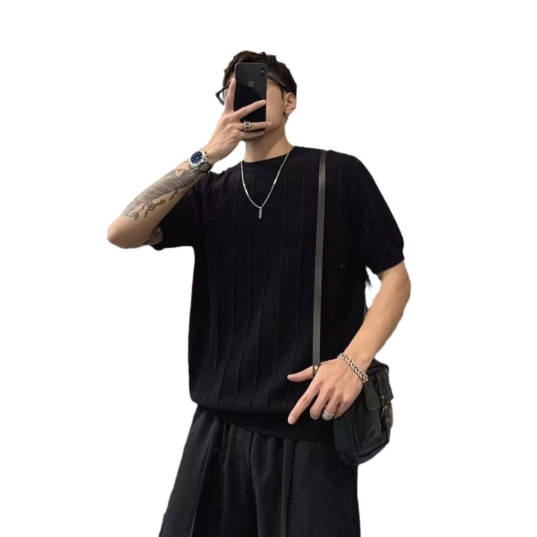 高级品质男装短袖T恤衫男夏季针织条纹体恤时尚休闲透气轻熟上衣