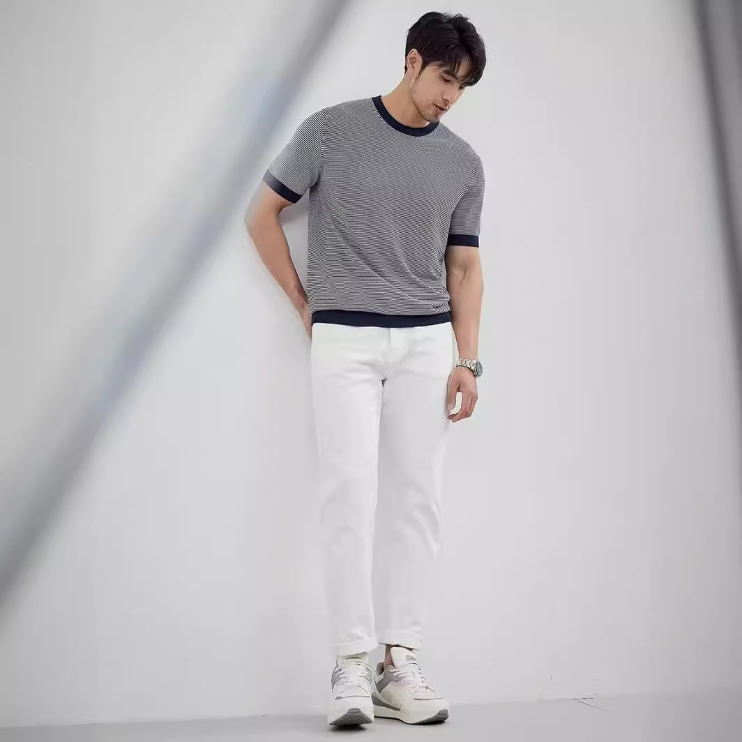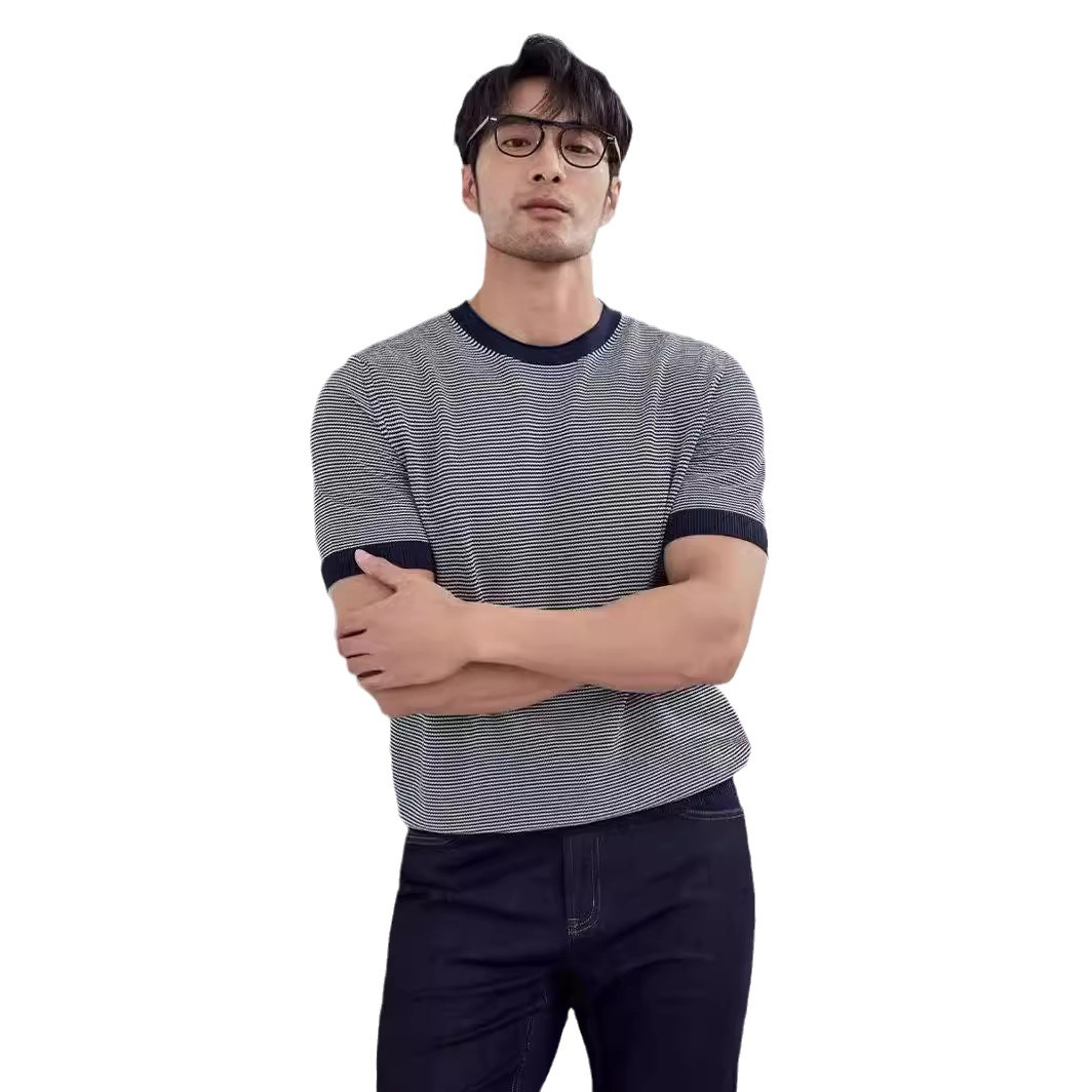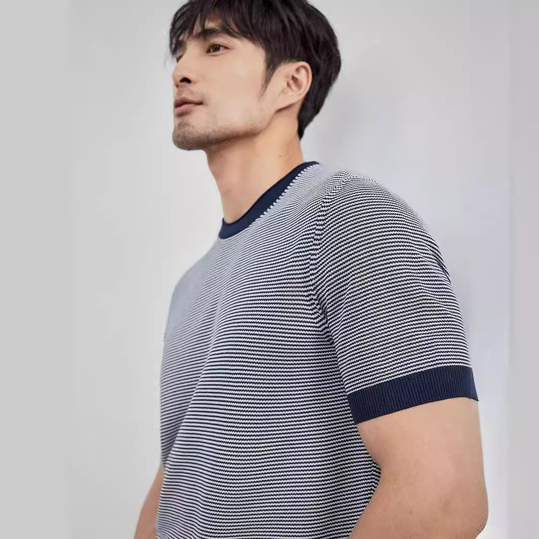 冰丝圆领针织衫短袖夏季t恤细条纹帅气半截袖打底透气薄款撞色T恤