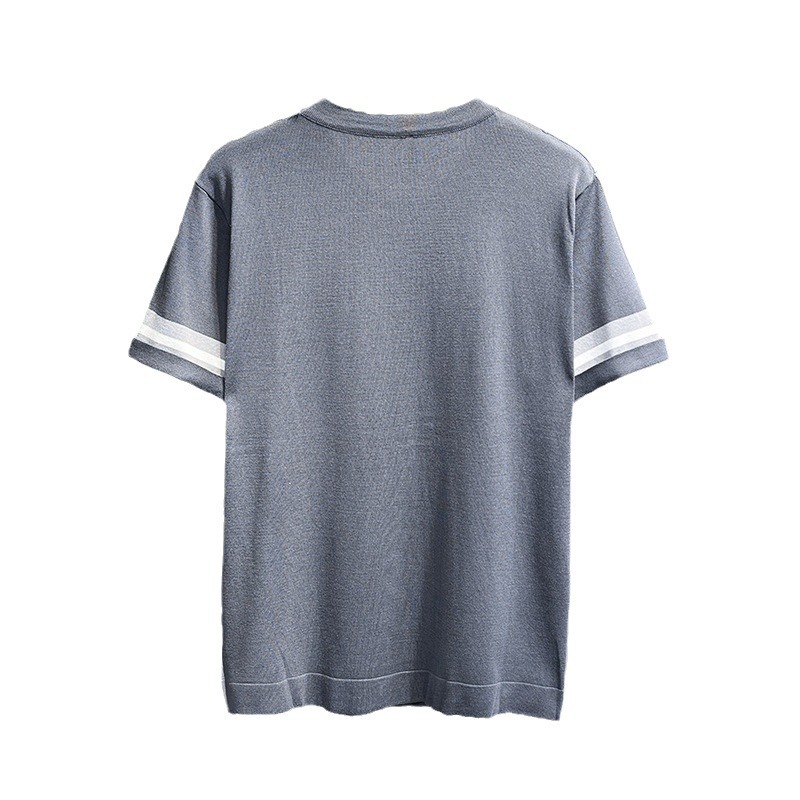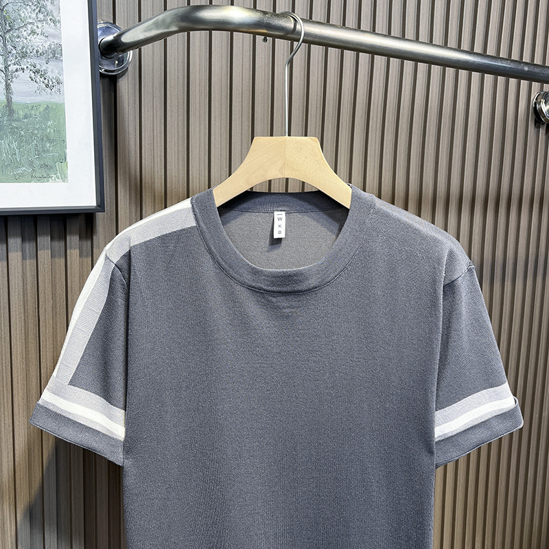 夏季韩式轻奢冰丝针织短袖男轻薄舒适透气冰感条纹设计感圆领T恤