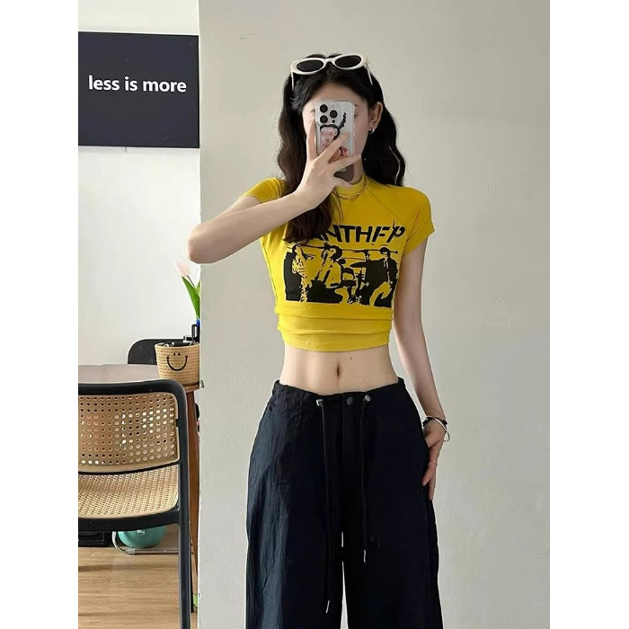 美式黄色正肩女生短袖t恤女夏季多巴胺修身短款甜辣jazz爵士上衣