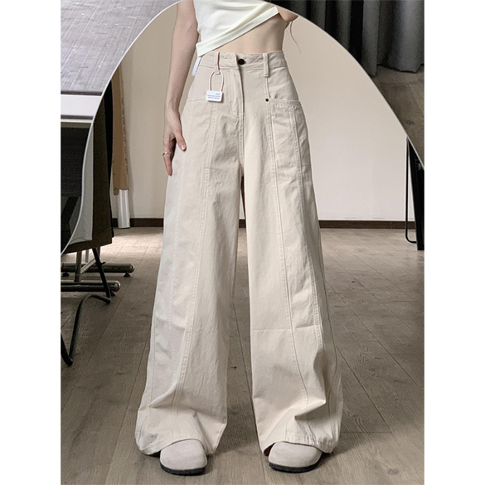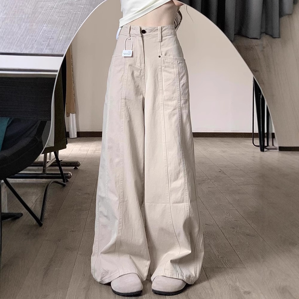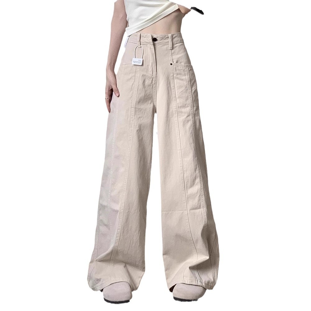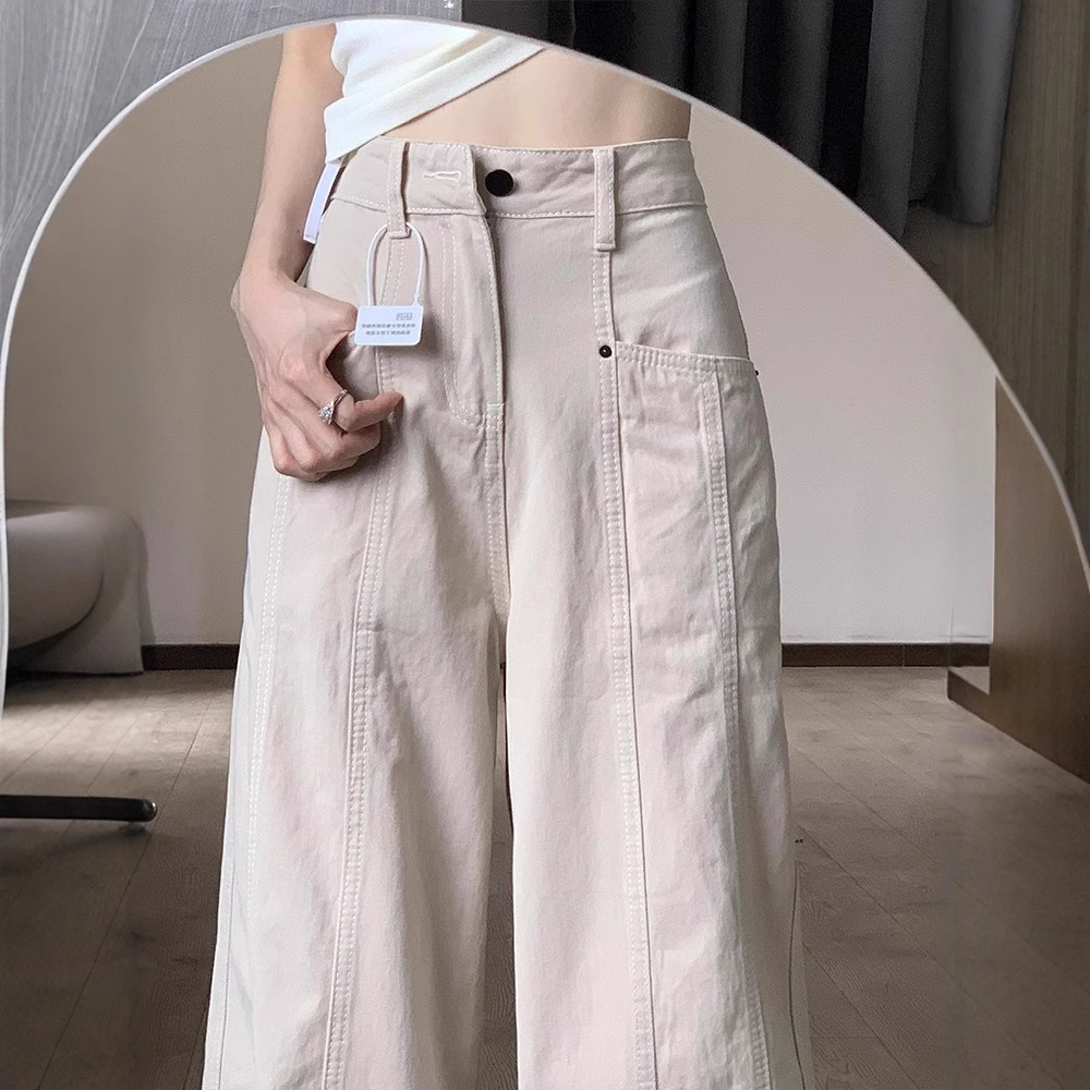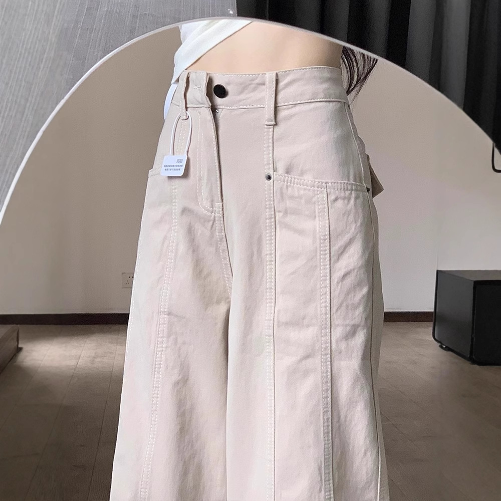 杏色设计感a字大喇叭阔腿牛仔裤女春秋季高腰宽松拖地工装长裤子