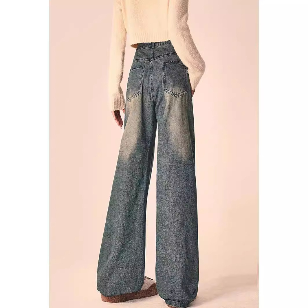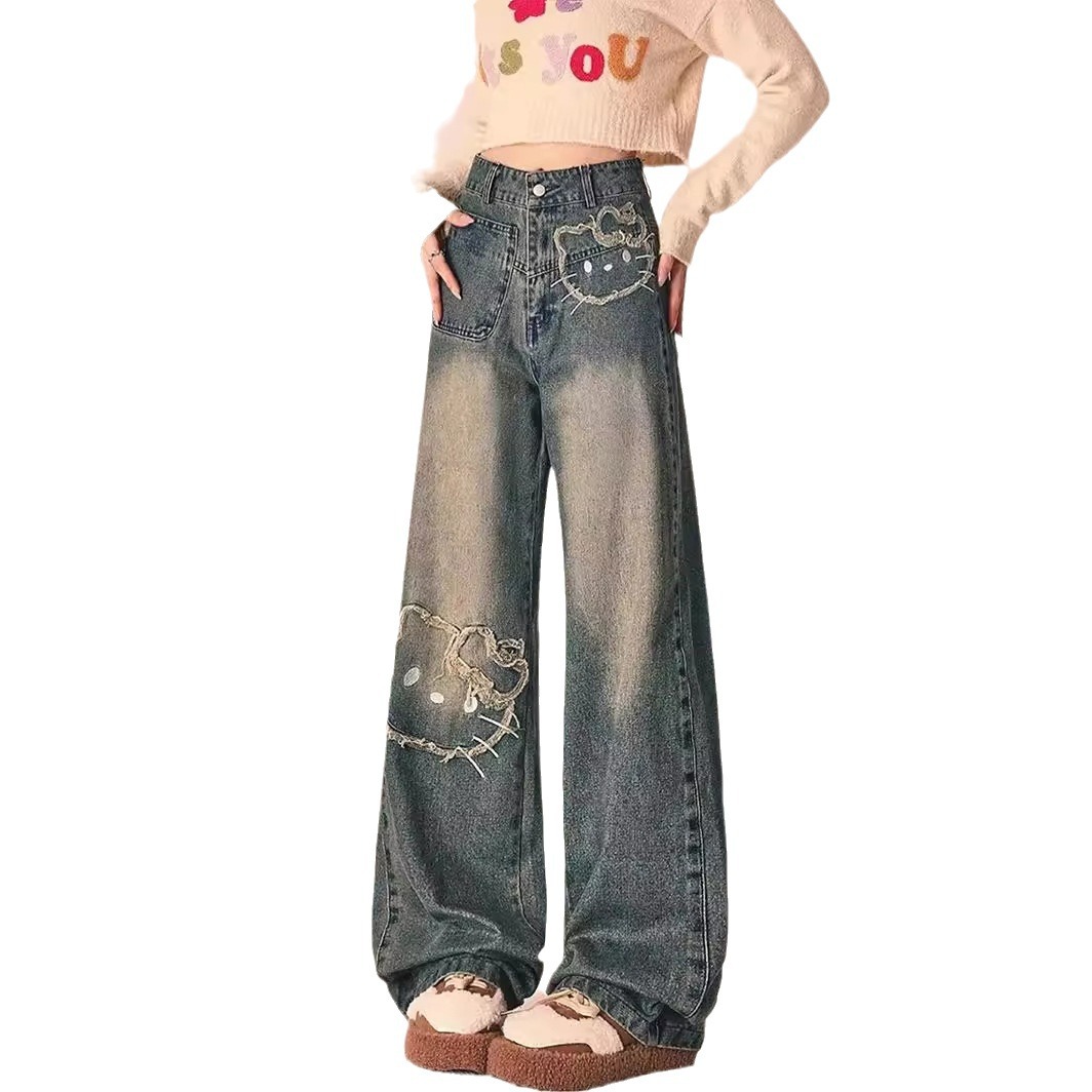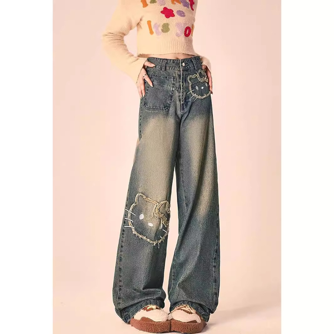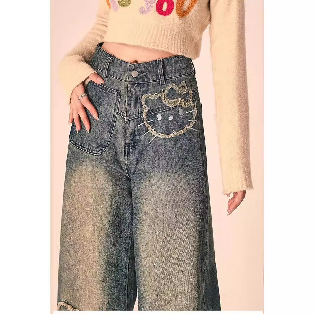 卡通图案kitty做旧学生牛仔裤女夏季美式复古设计直筒休闲宽松裤