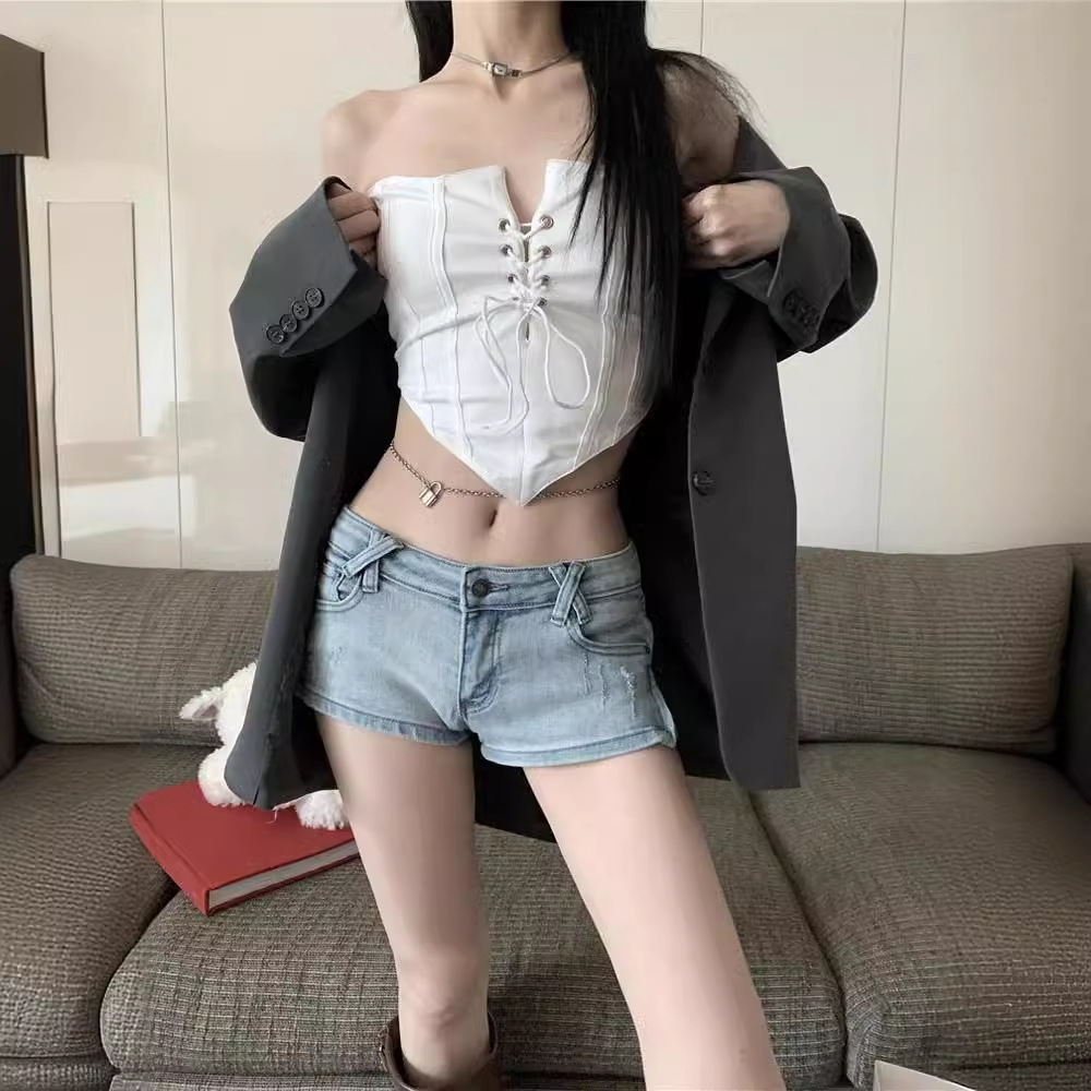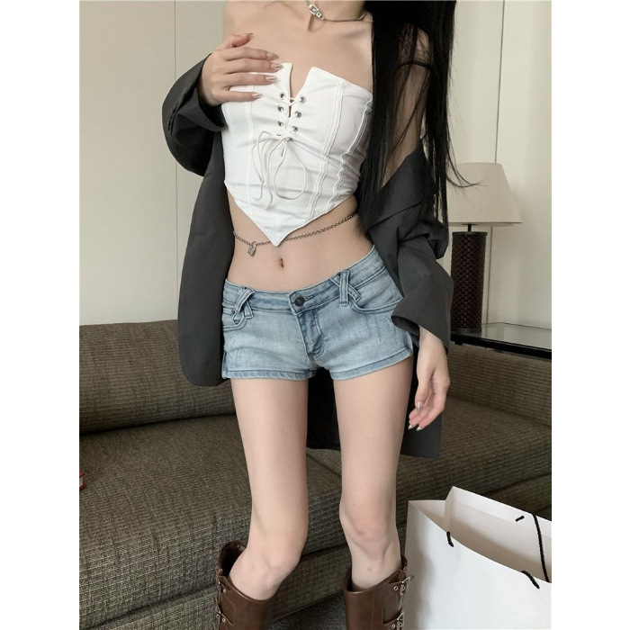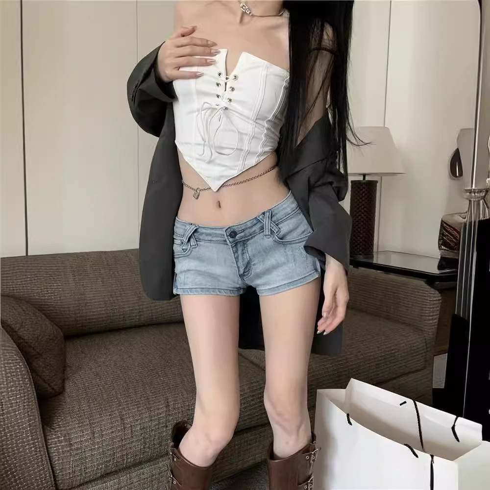 辣妹风复古新款韩版开叉低腰显瘦弹力修身牛仔裤女短裤热裤子