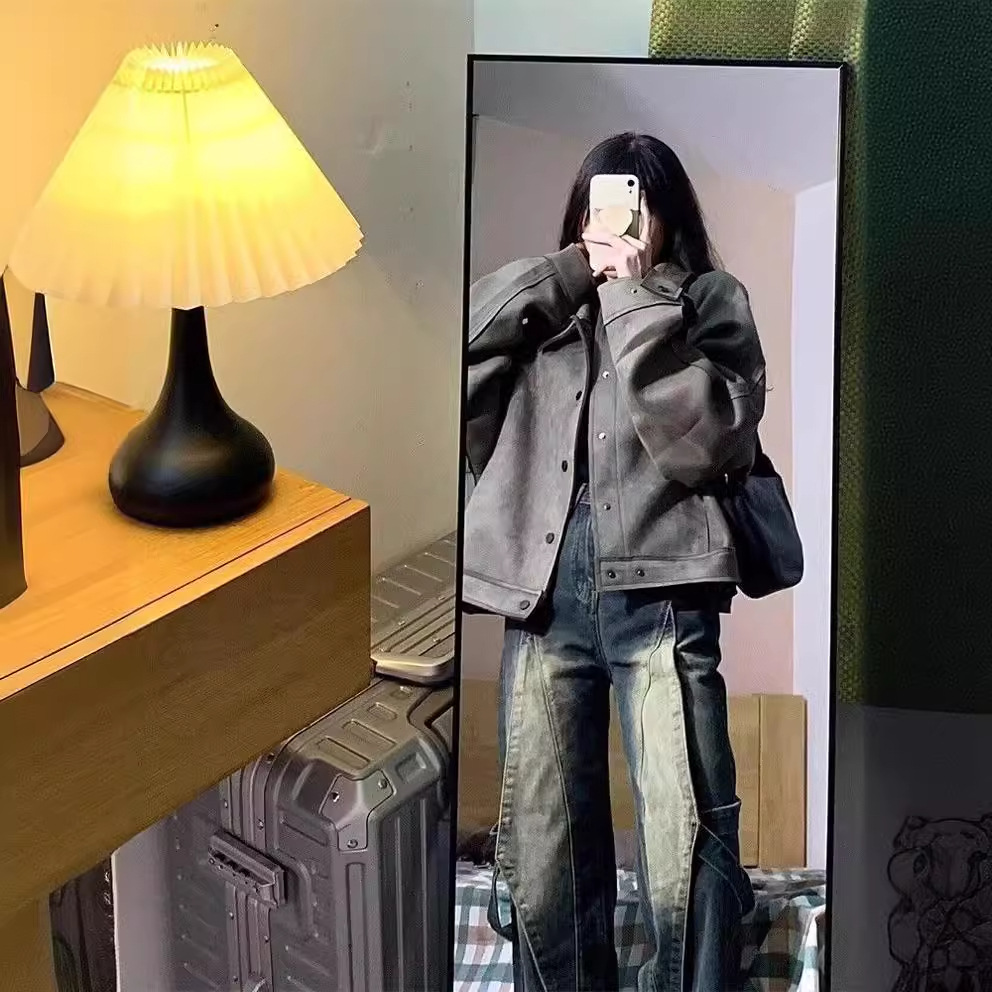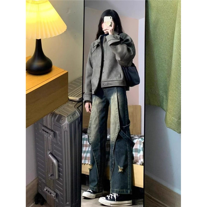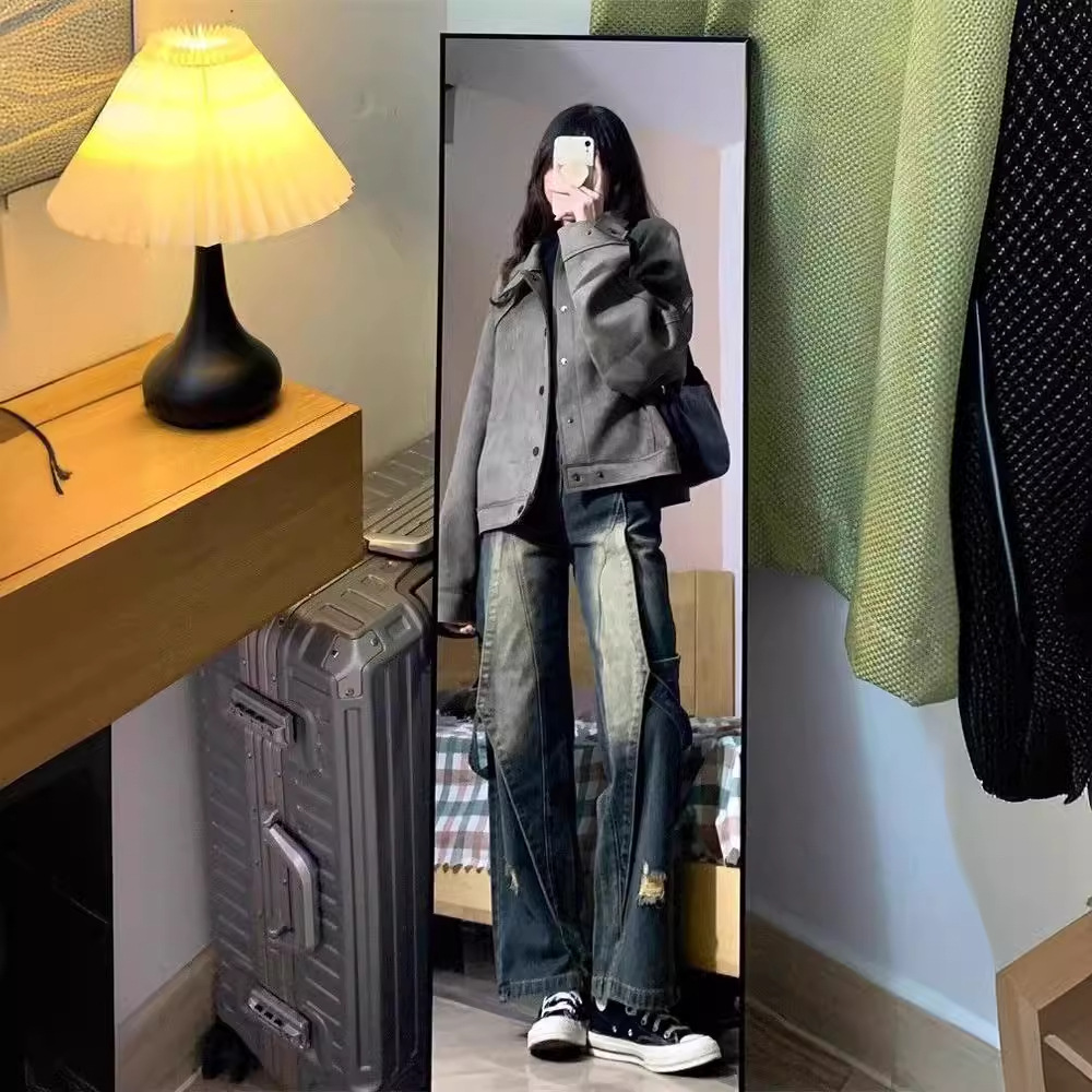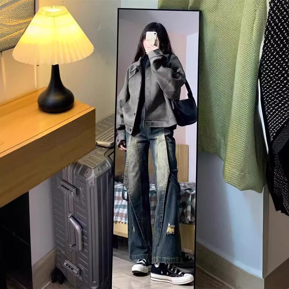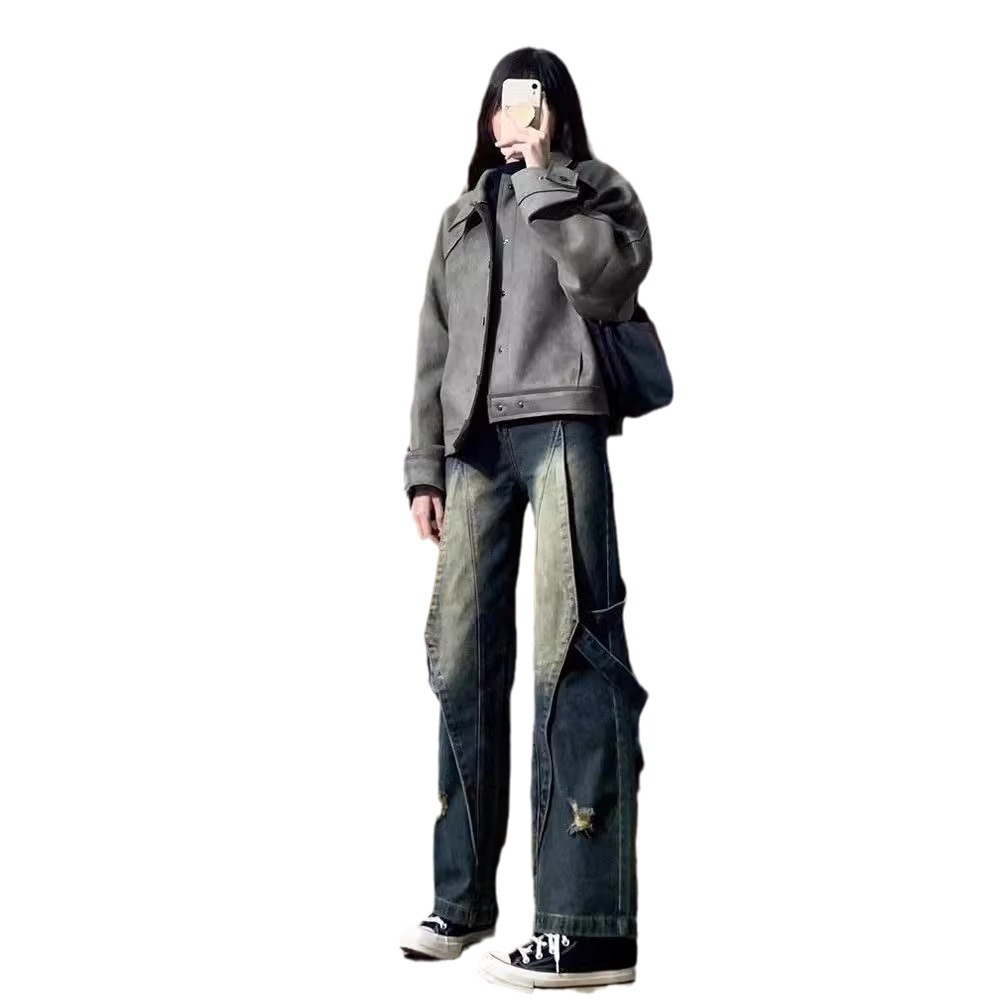 美式复古做旧拼接设计牛仔裤女夏季新款高腰显瘦直筒宽松阔腿裤子