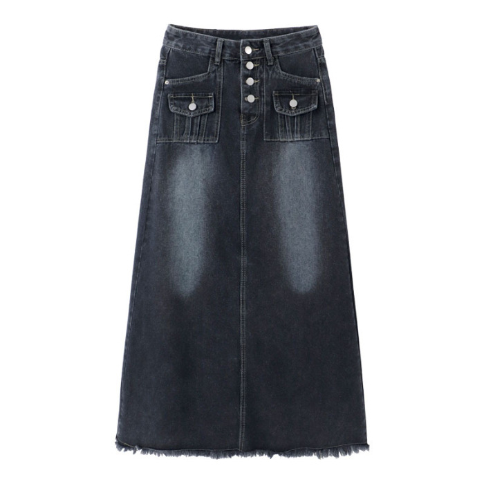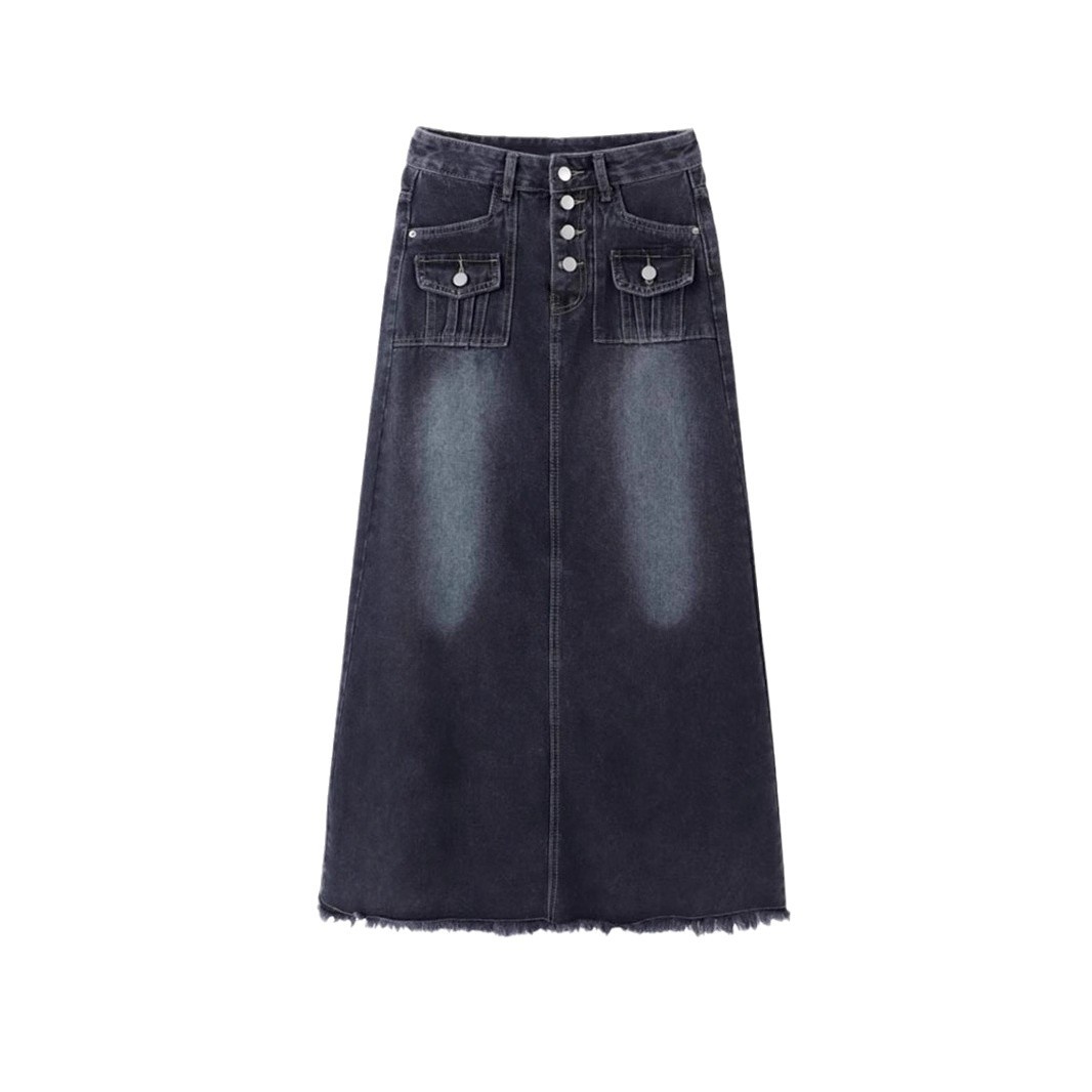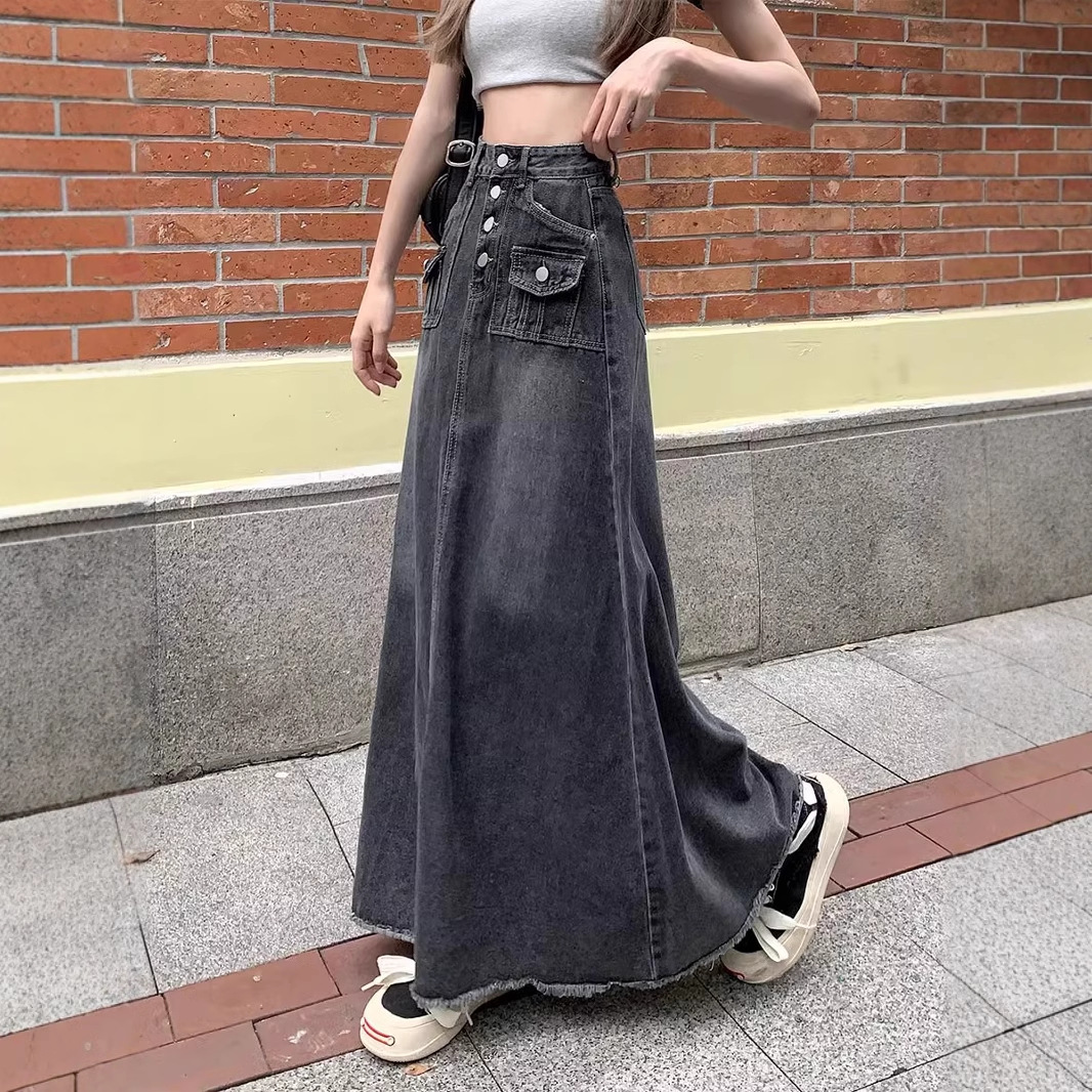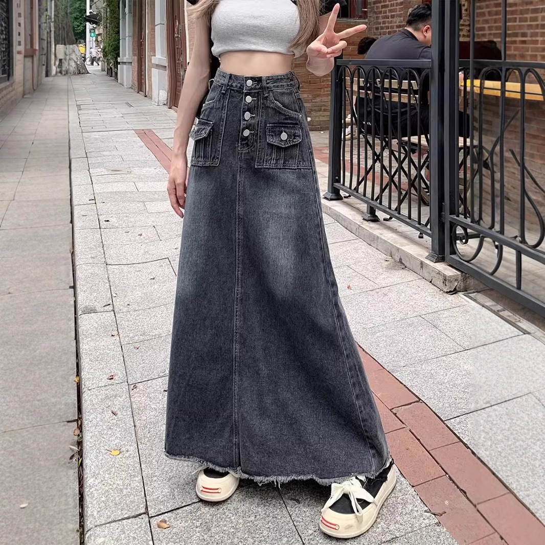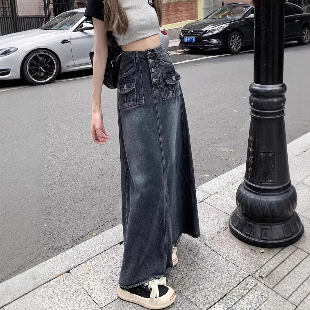 美式复古深蓝色牛仔半身裙女新款小个子A字长裙长款裙子