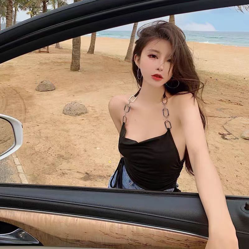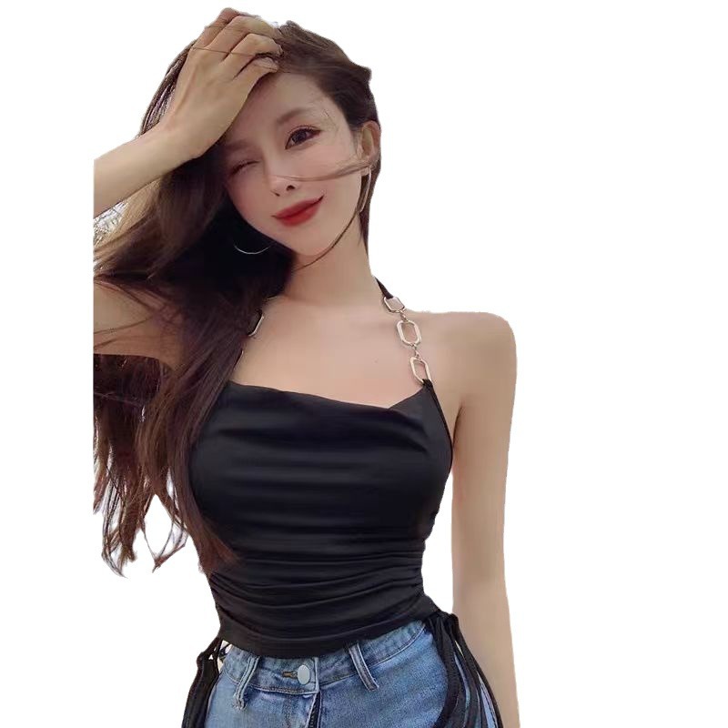 美式辣妹性感黑色小吊带背心女装夏季链条挂脖别致内搭打底衫上衣