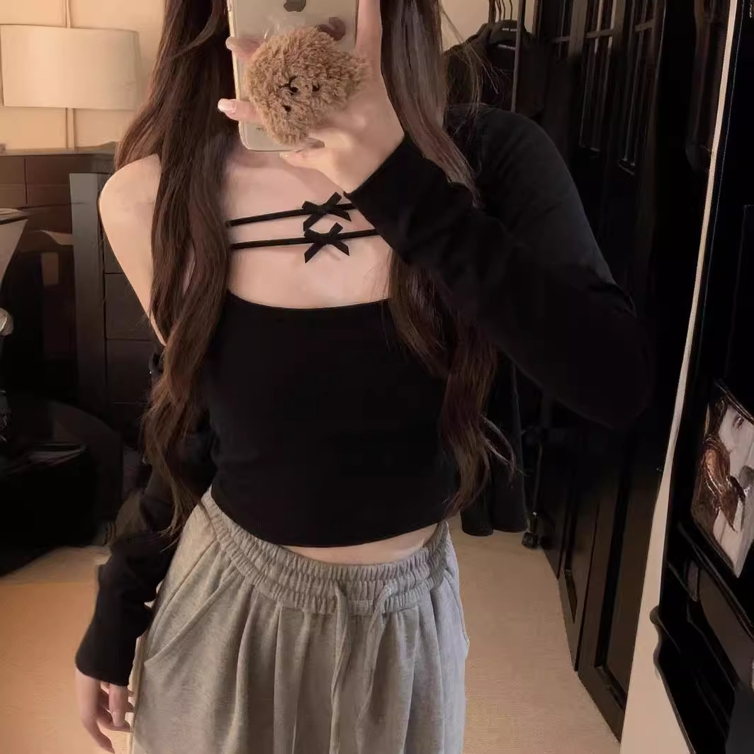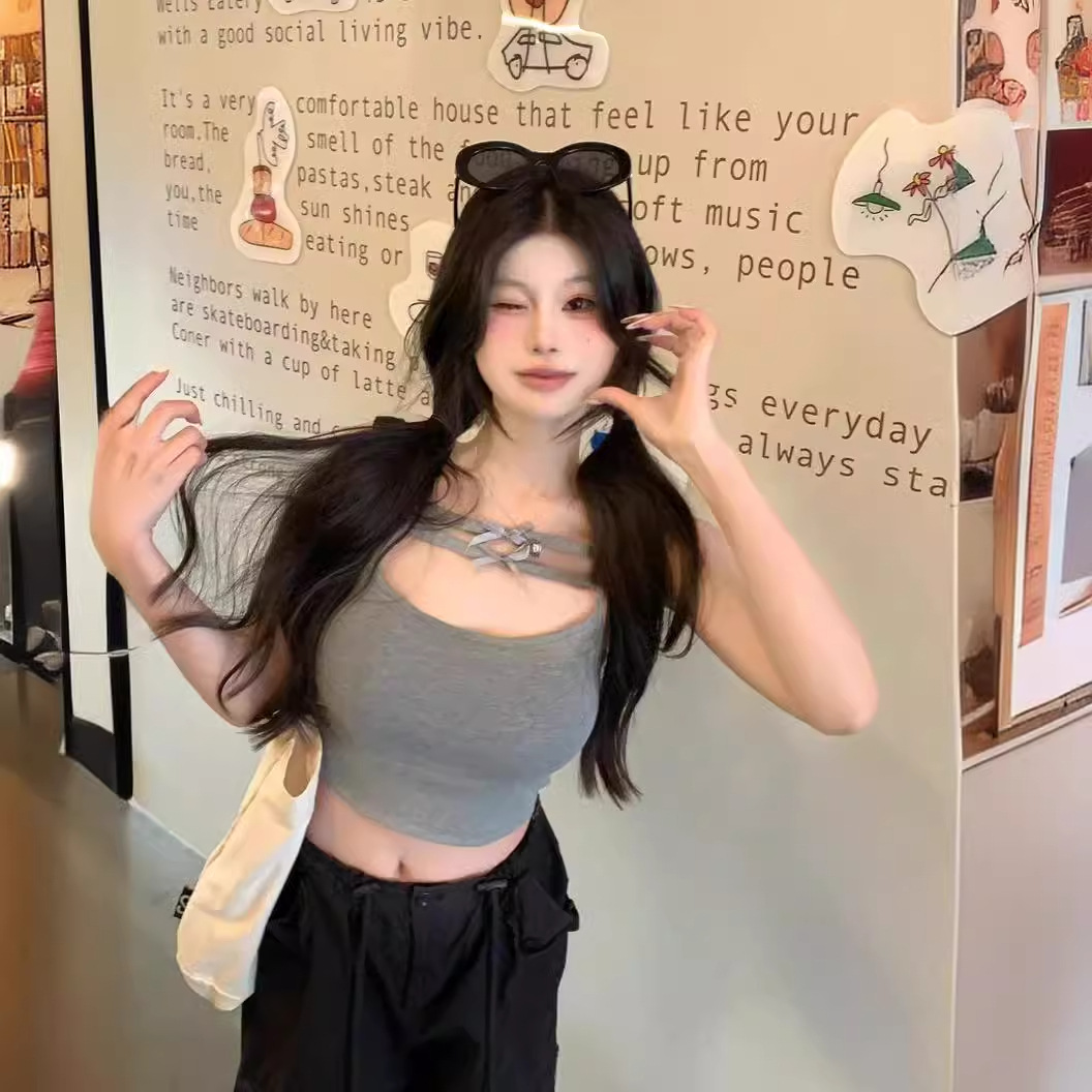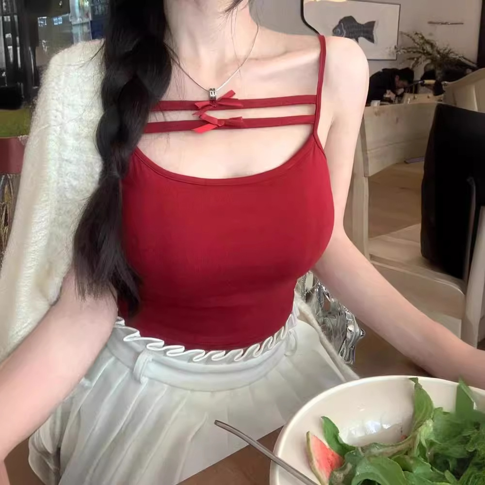 蝴蝶结带胸垫小吊带女夏季紧身无袖背心纯欲性感辣妹露脐短款上衣