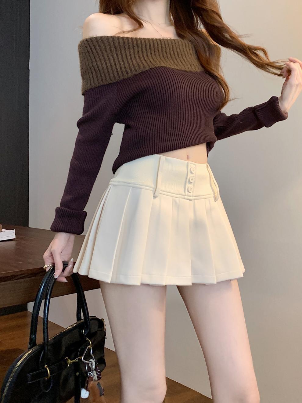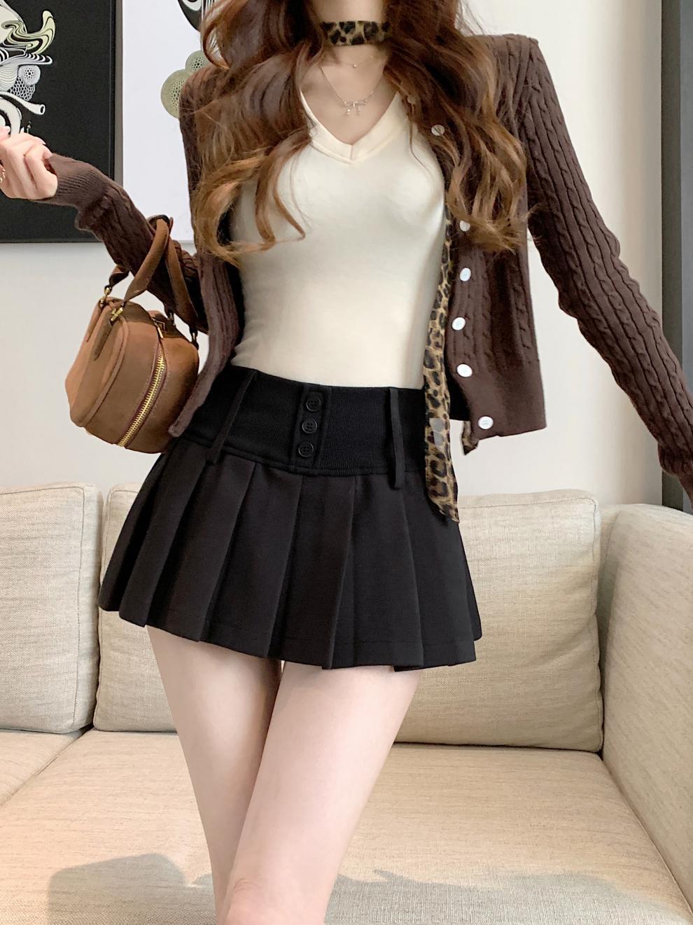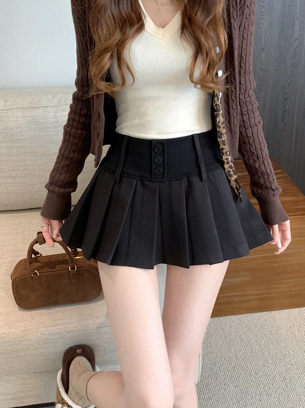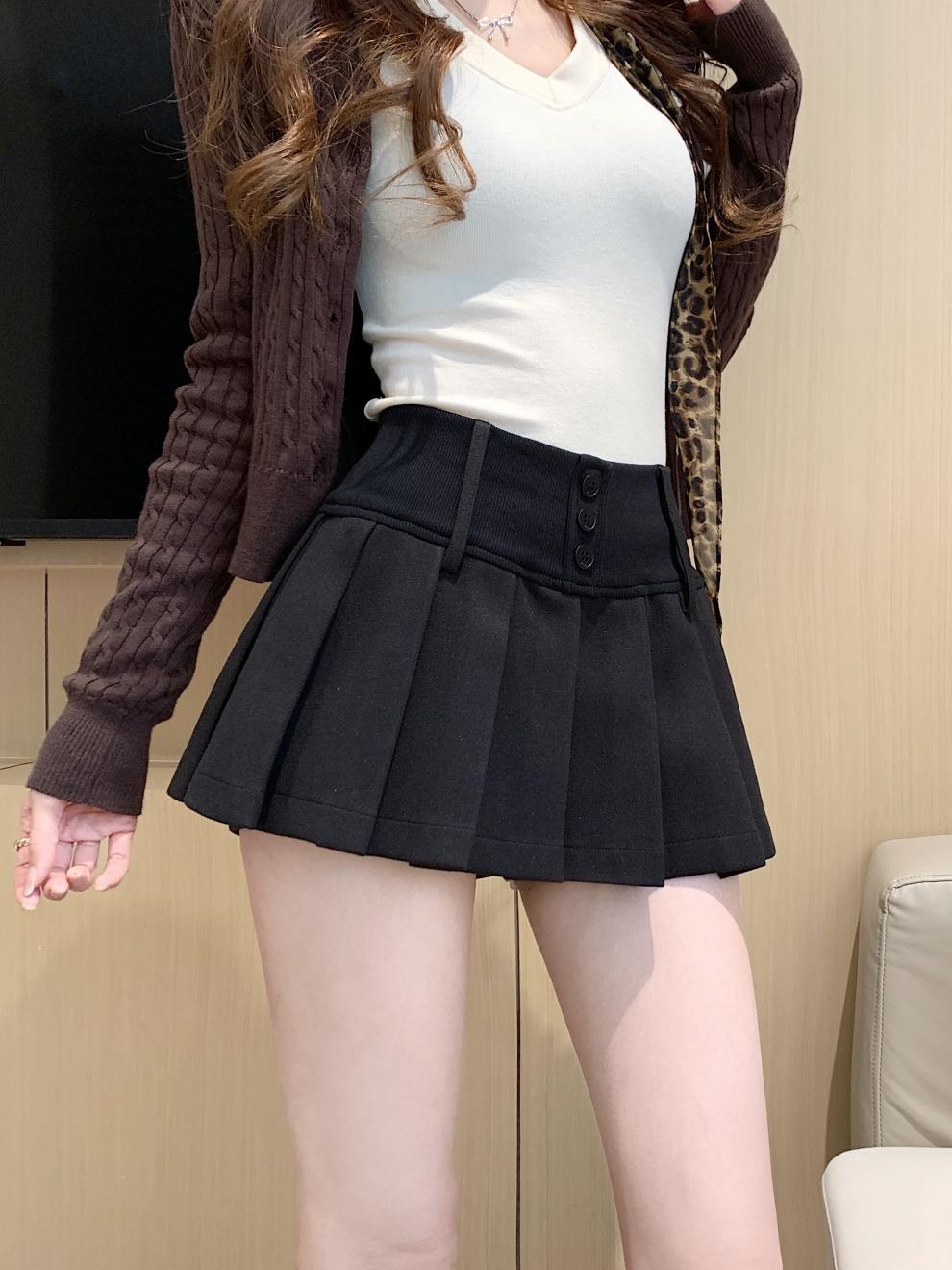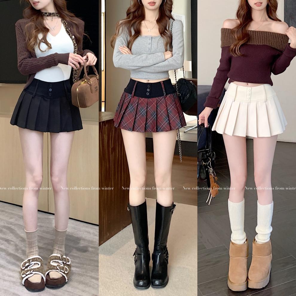 复古辣妹纯色撞色格子高腰宽腰百褶半身A字裙裤