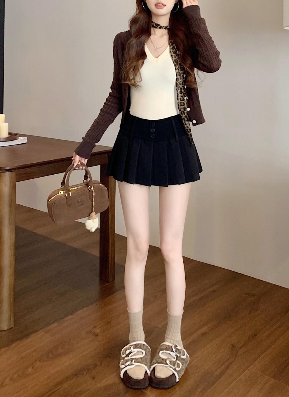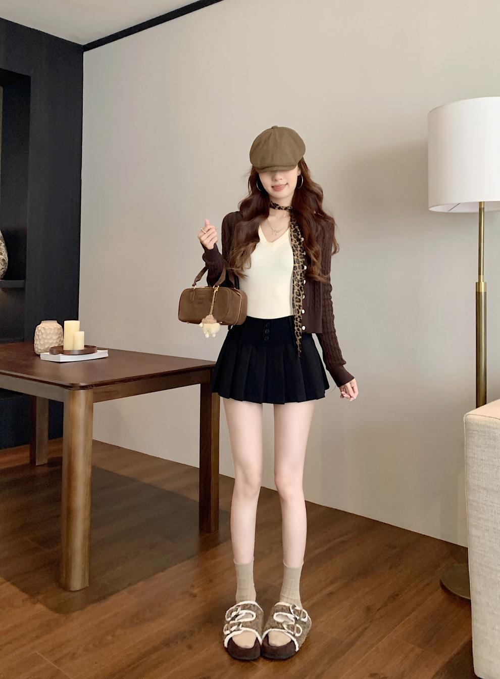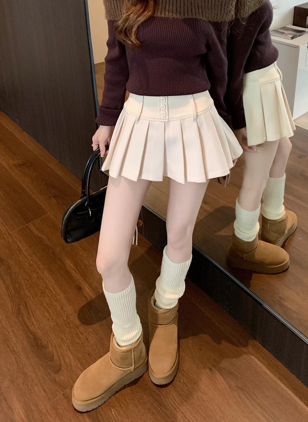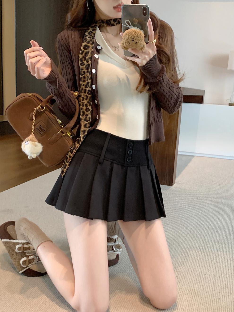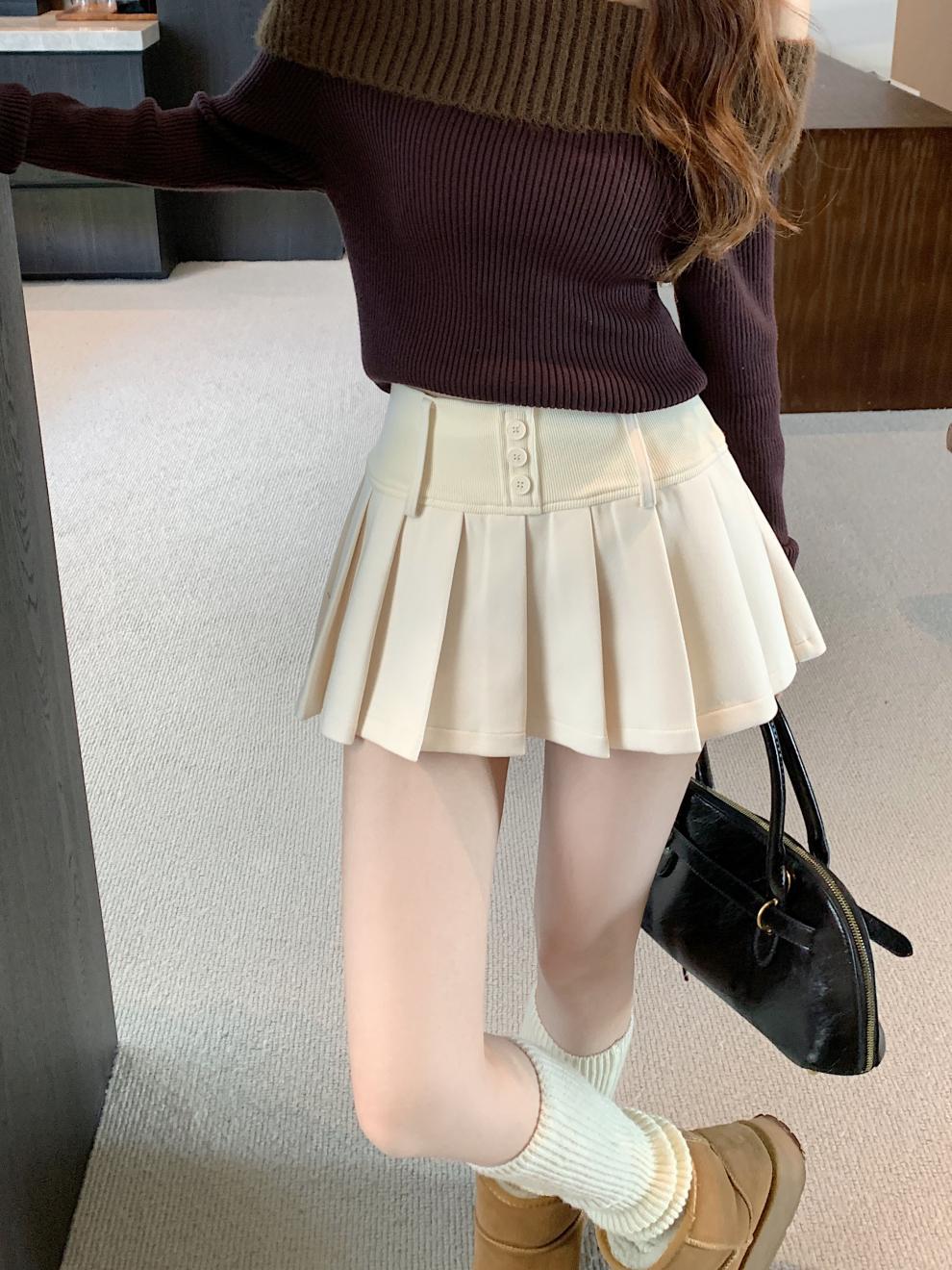 复古辣妹纯色撞色格子高腰宽腰百褶半身A字裙裤