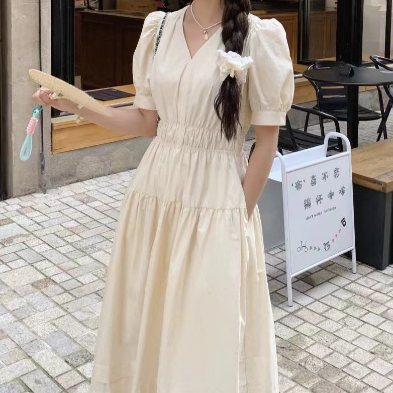 短袖浅蓝色连衣裙女夏季新款V领显瘦法式长裙