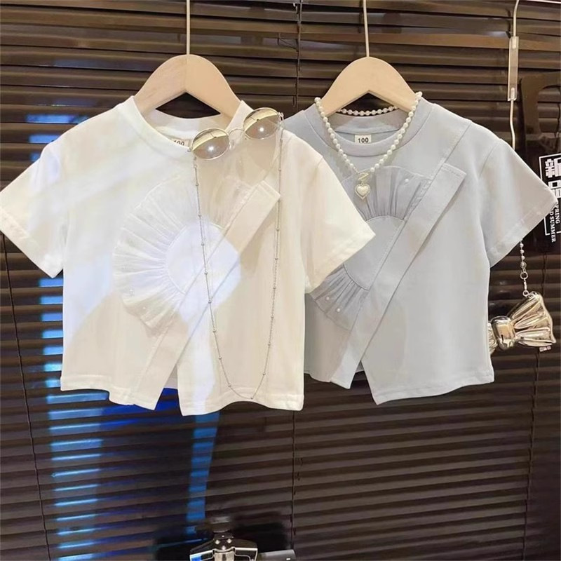 2025韩版女童短袖体恤衫夏季新款时尚洋气纯色荷叶边短袖T恤上衣
