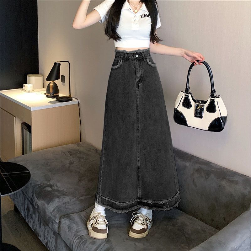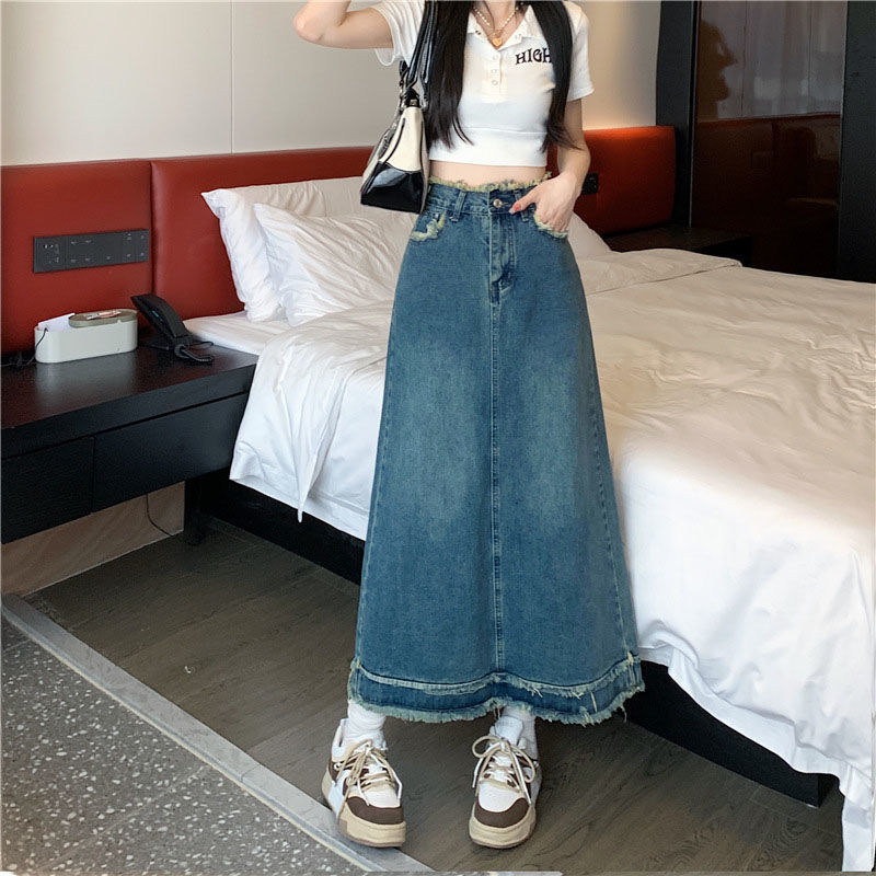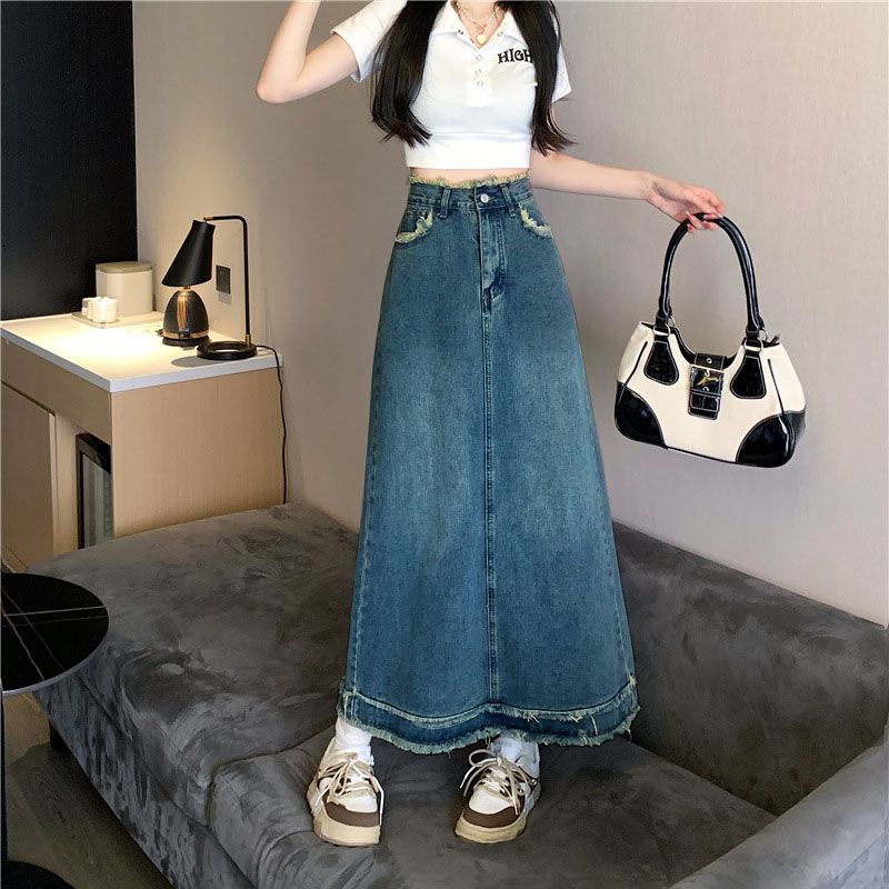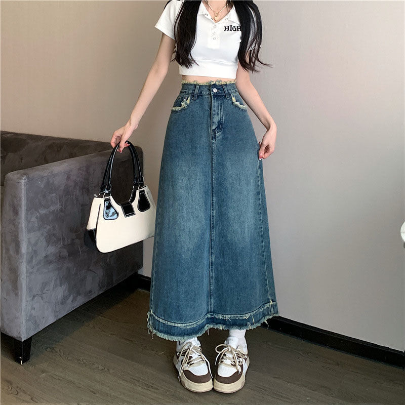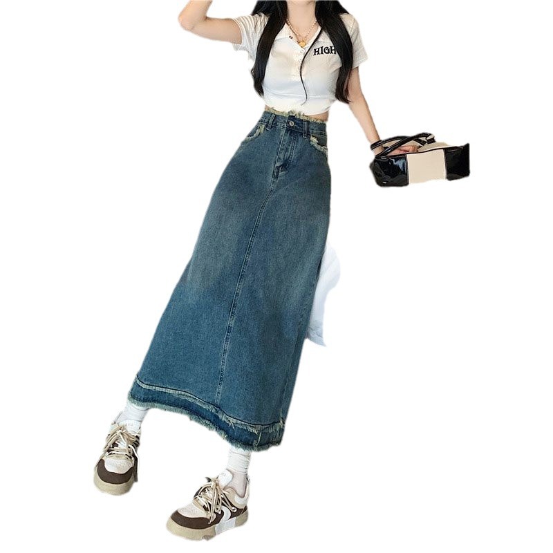 春夏新款a字裙复古蓝牛仔半身裙女高腰直筒中长裙洋气高级