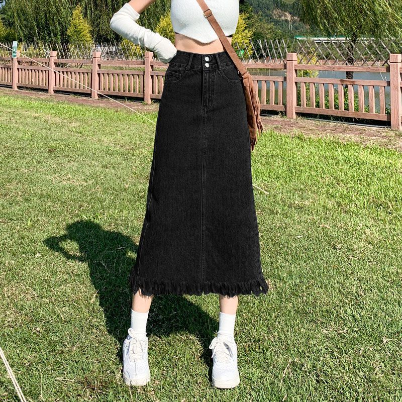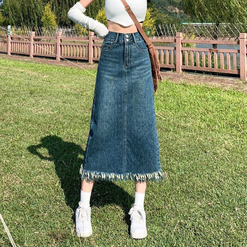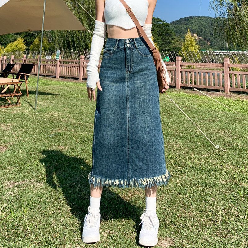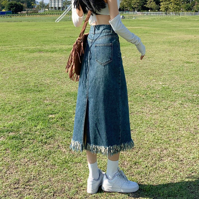 流苏后开叉牛仔半身裙女洋气高腰新款a字包臀中长裙显瘦