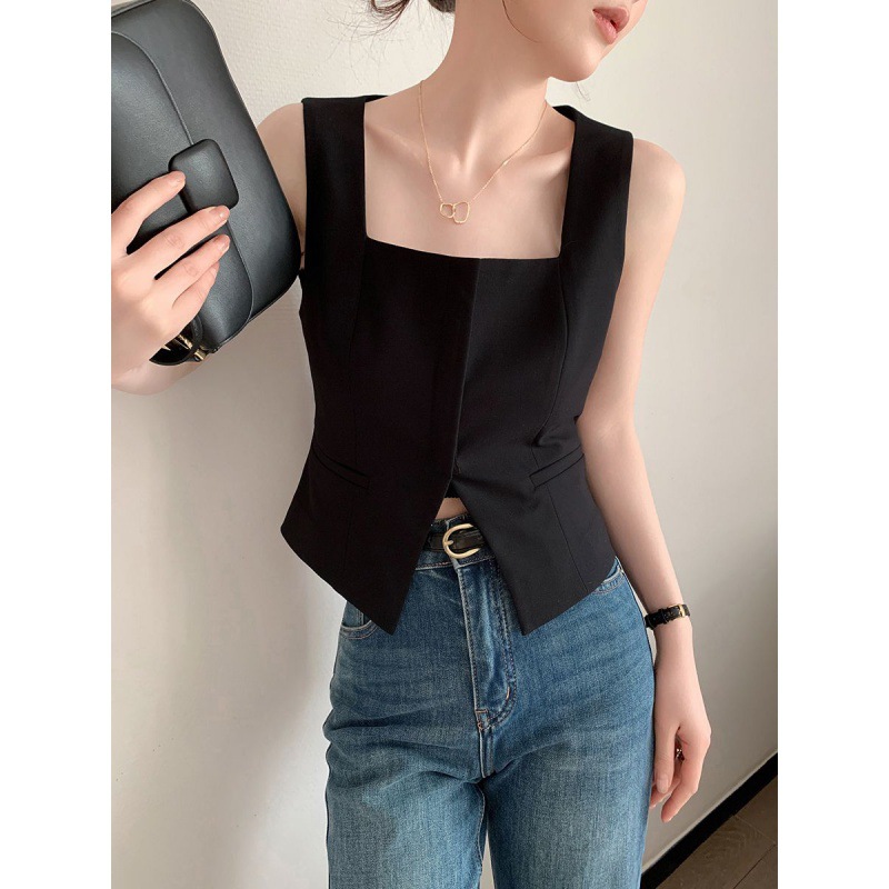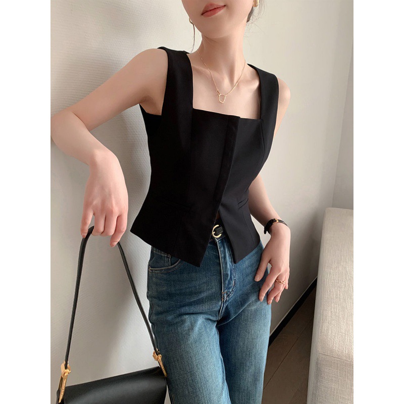 高品质黑色方领无袖马甲女夏季时尚新设计感小众镂空开叉时尚上衣
