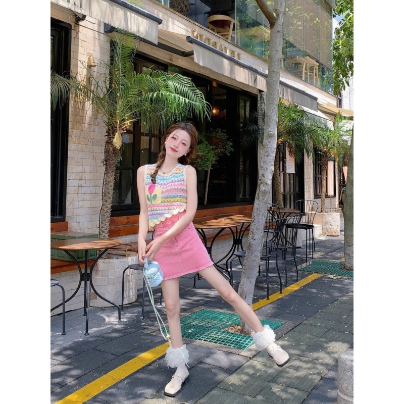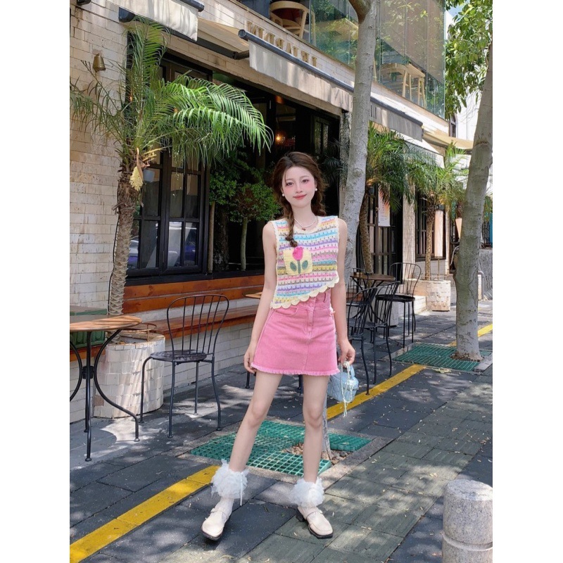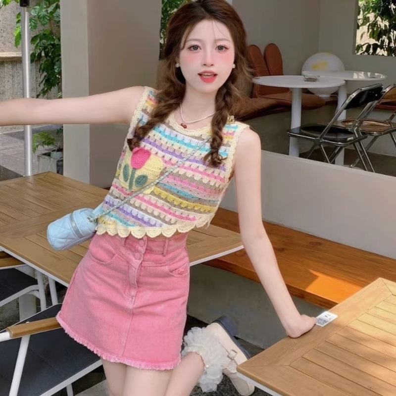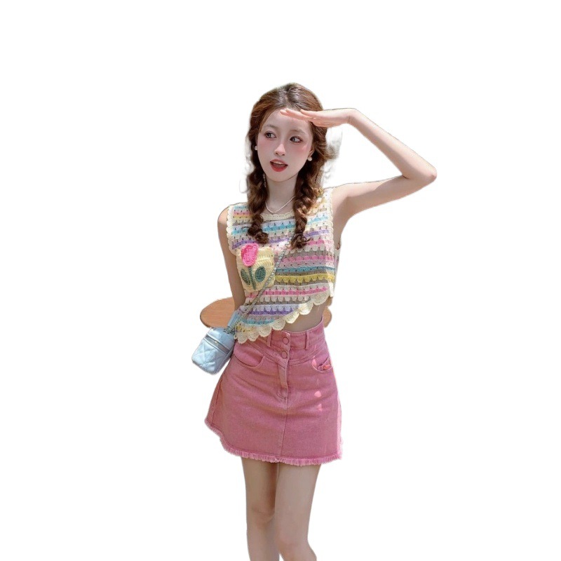 高品质多巴胺穿搭彩色条纹针织背心女夏季甜美风设计感不规则无袖