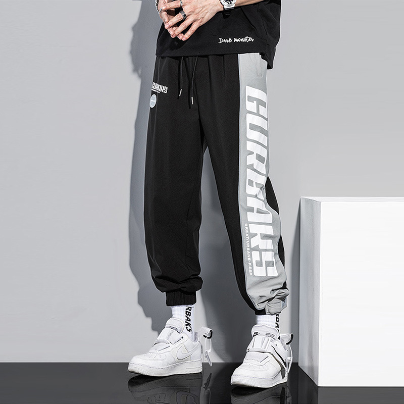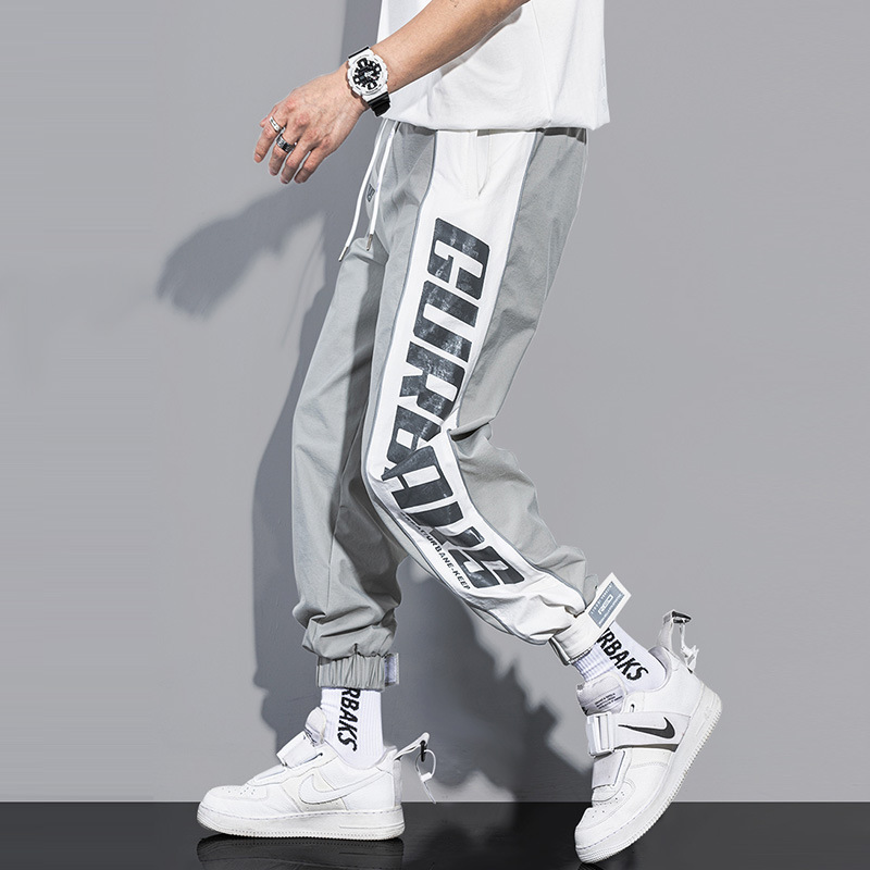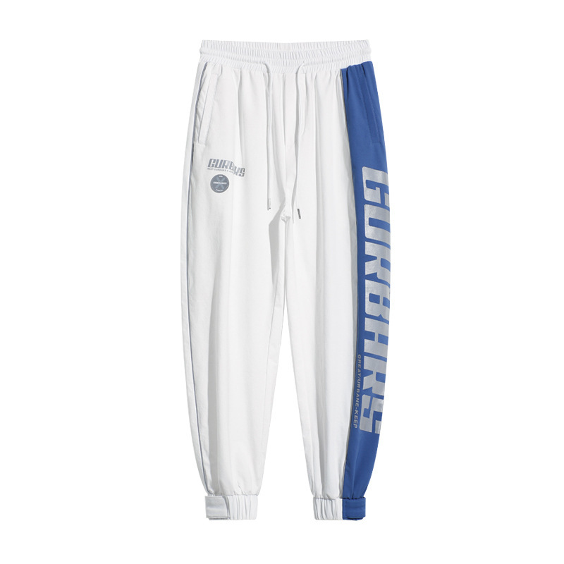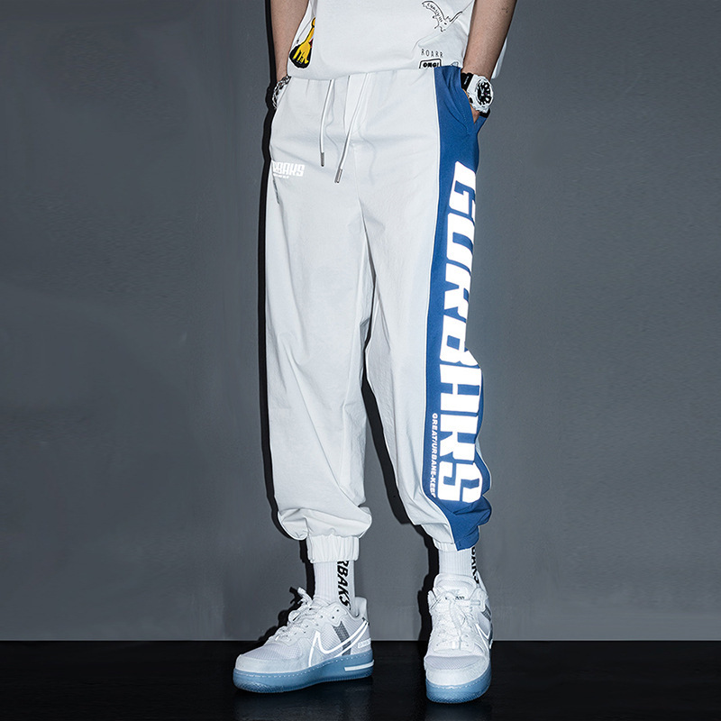 夏季薄款白色休闲运动裤男宽松抽绳束脚拼接撞色港风帅气男生裤子