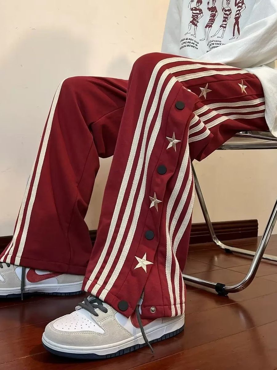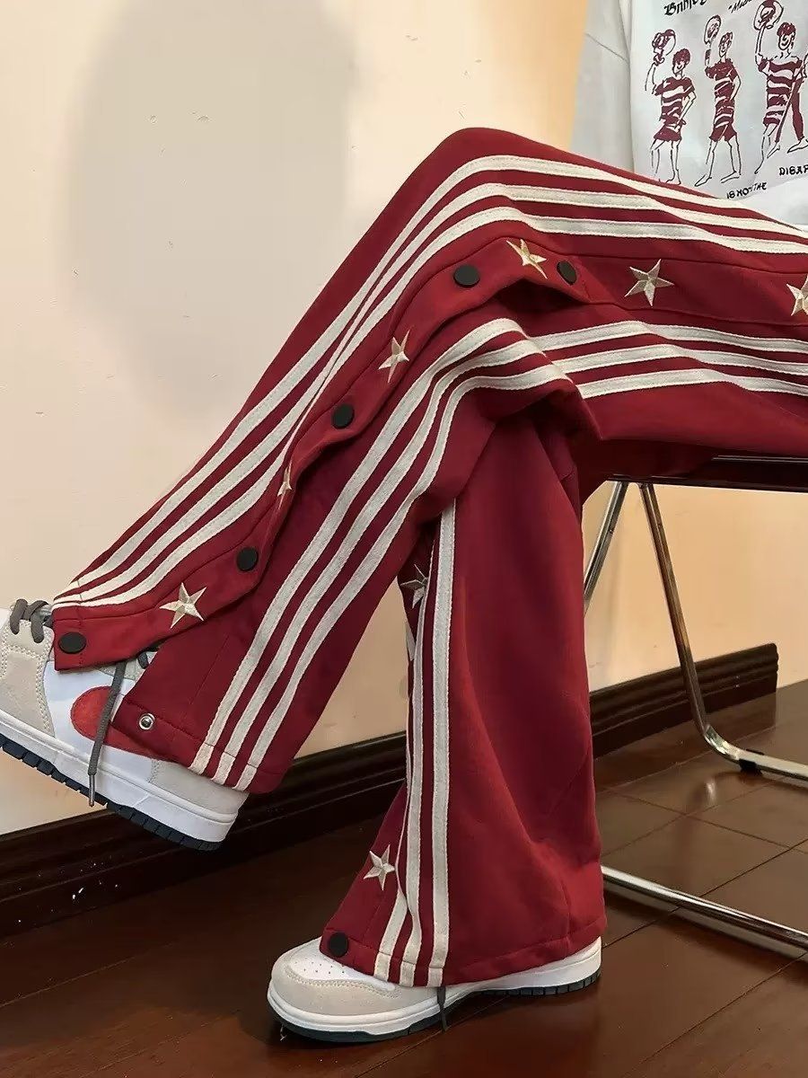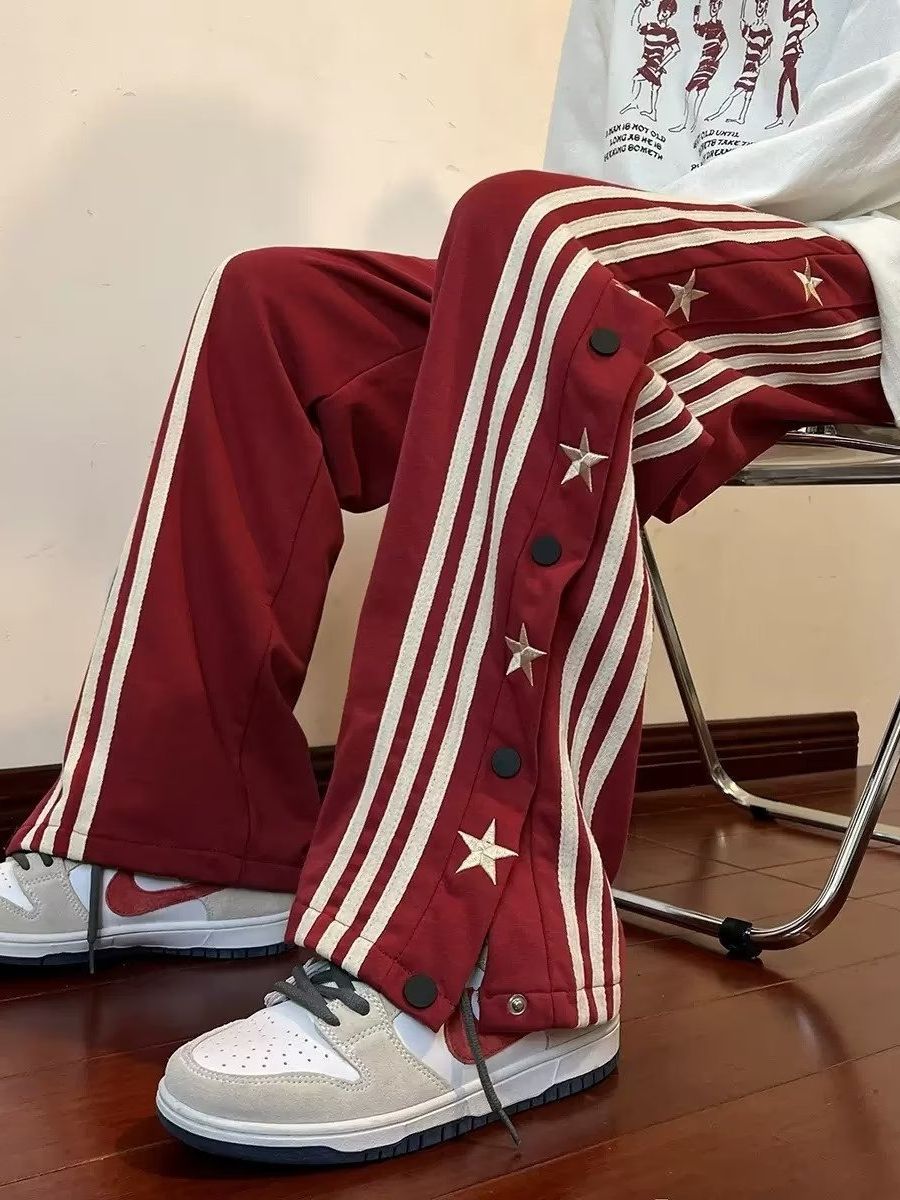 红色排扣休闲裤子男夏季新款宽松直筒条纹阔腿运动裤潮牌港风长裤