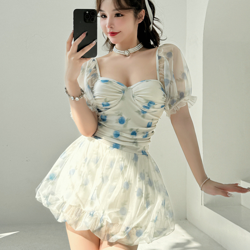 新款连体裙式女游泳装平角遮肚显瘦ins风仙范韩版女学生泳装